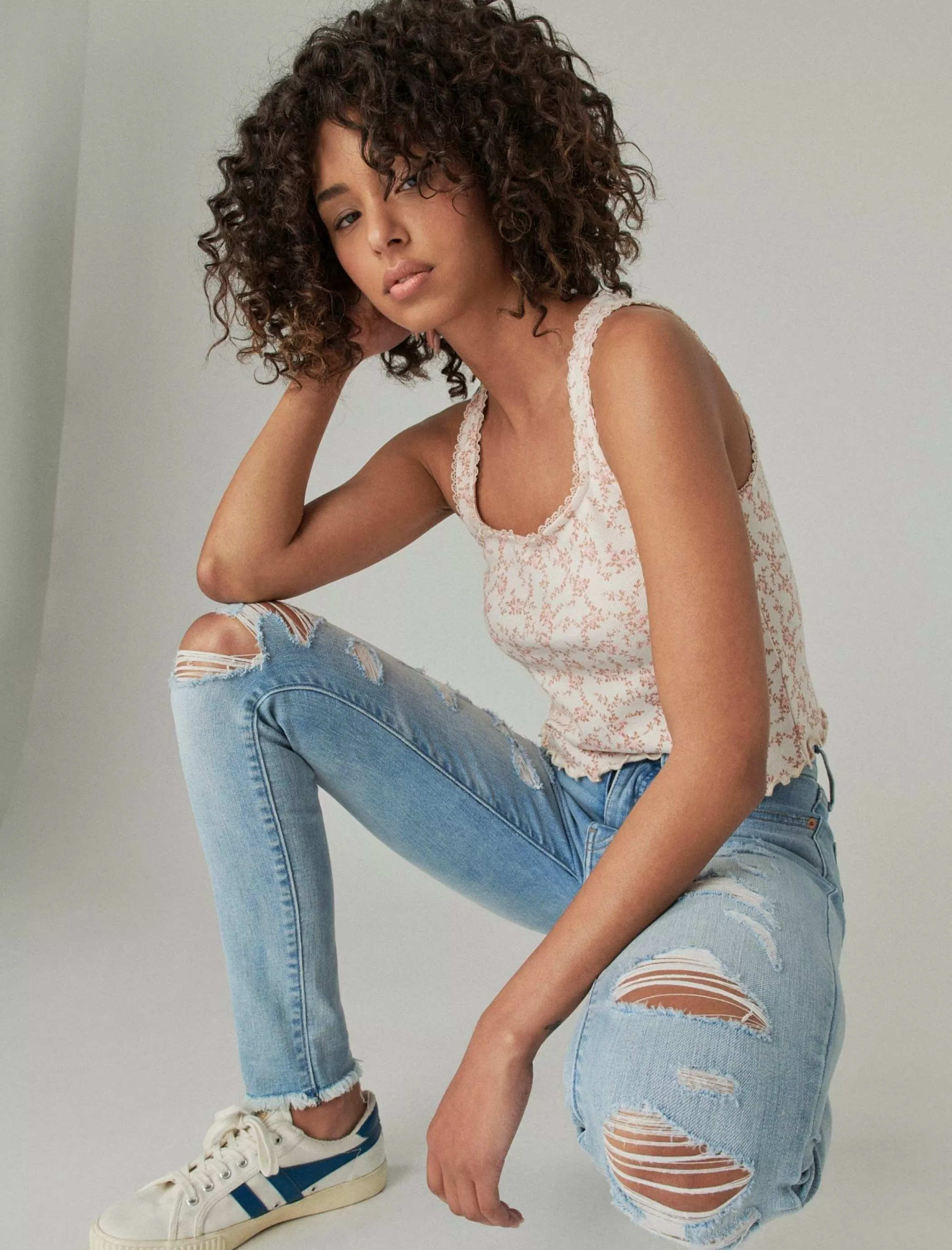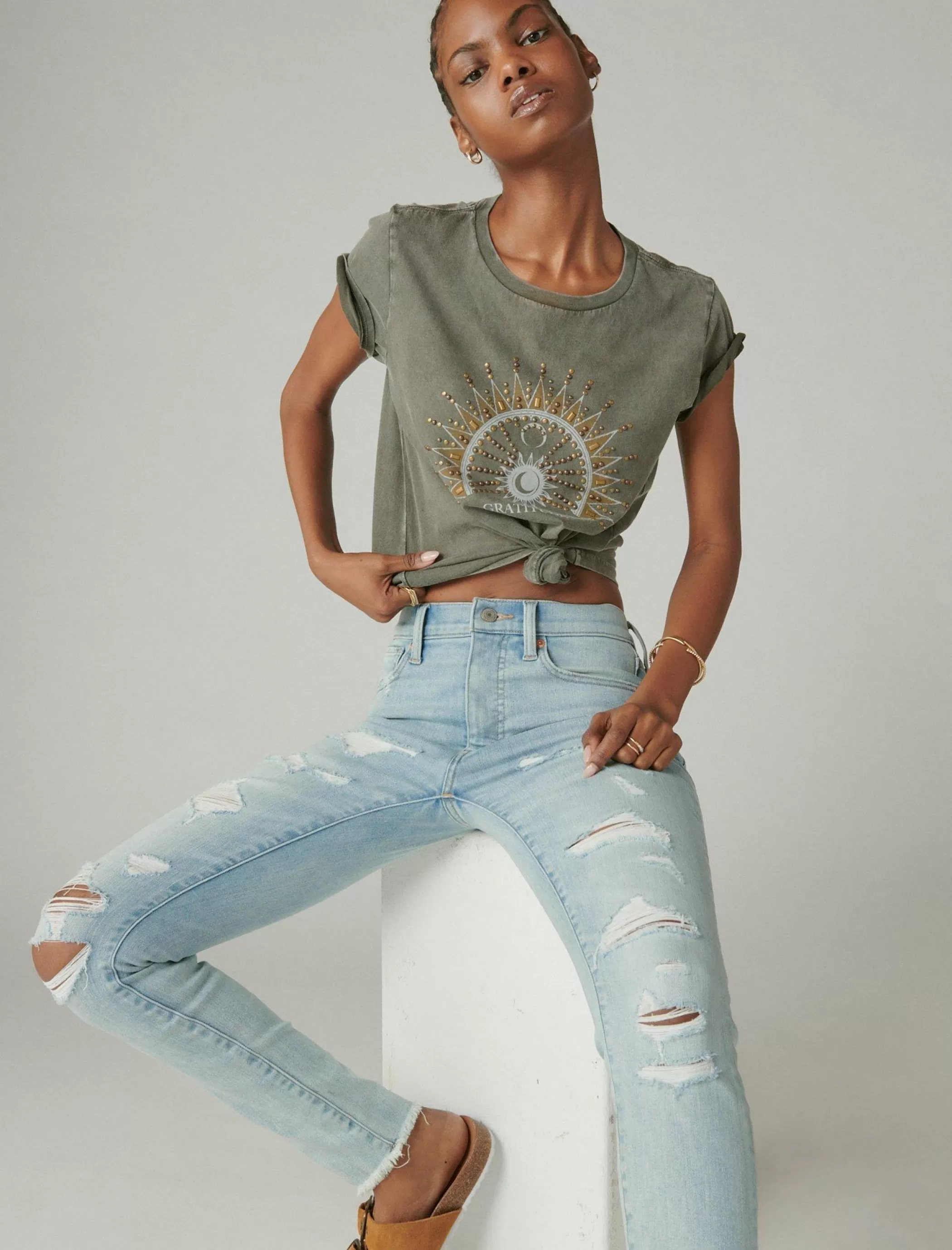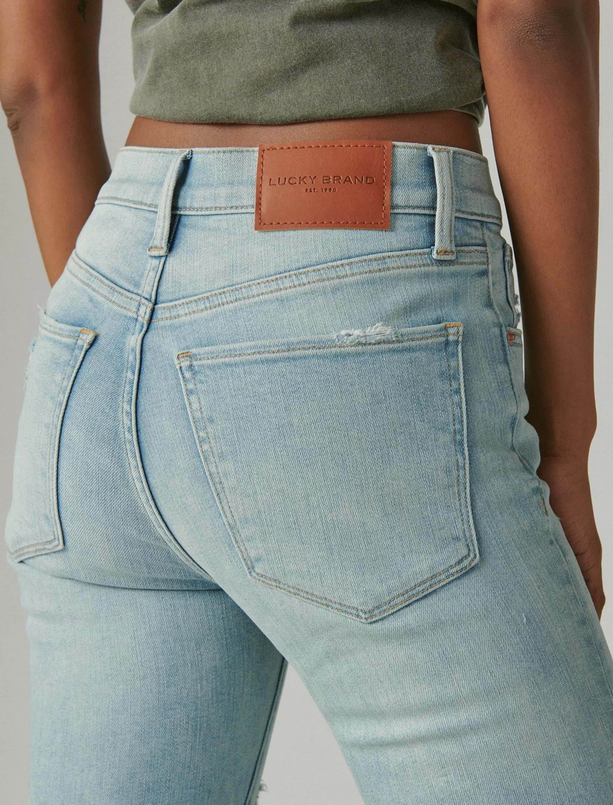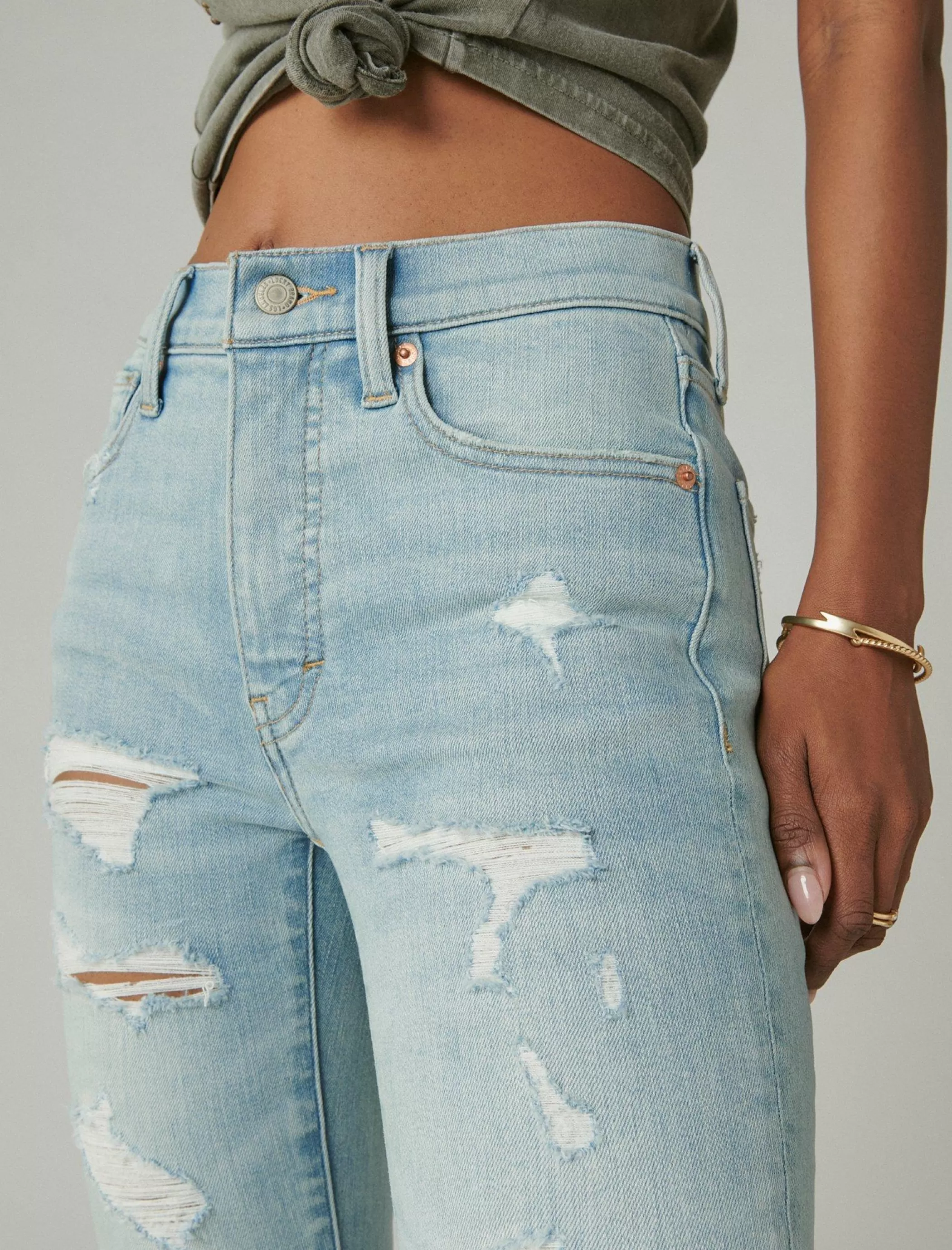 - Distressed light wash denim