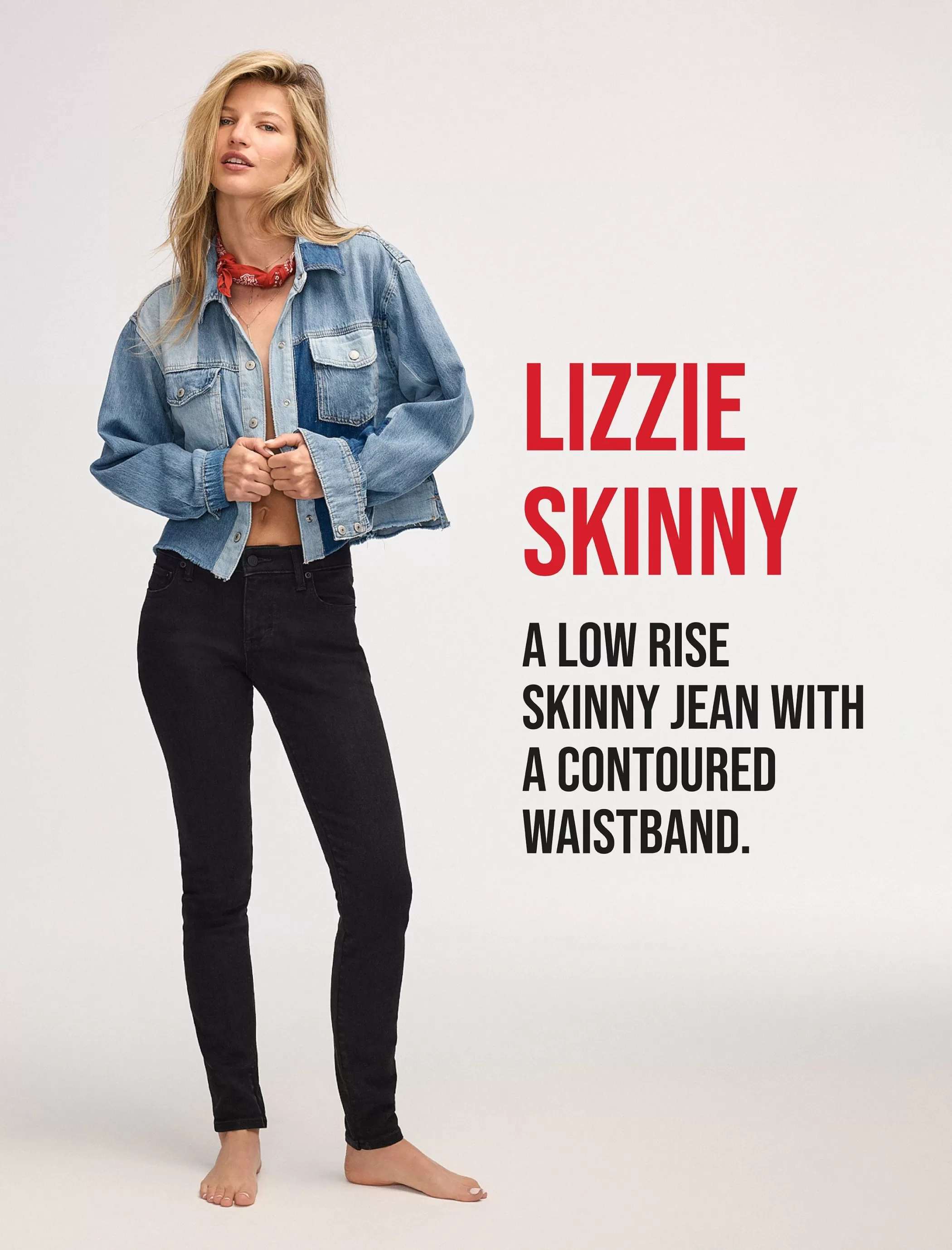 A feel-good skinny jean with a contoured waist, our Low Rise Lizzie shapes your backside to look great from every angle. With a skinny fit from the top through the ankle, this style is designed to show off your curves.