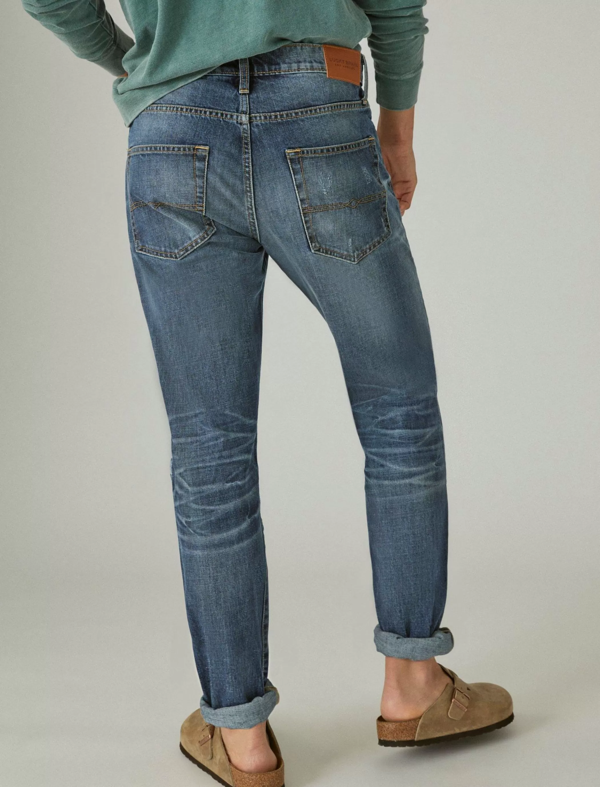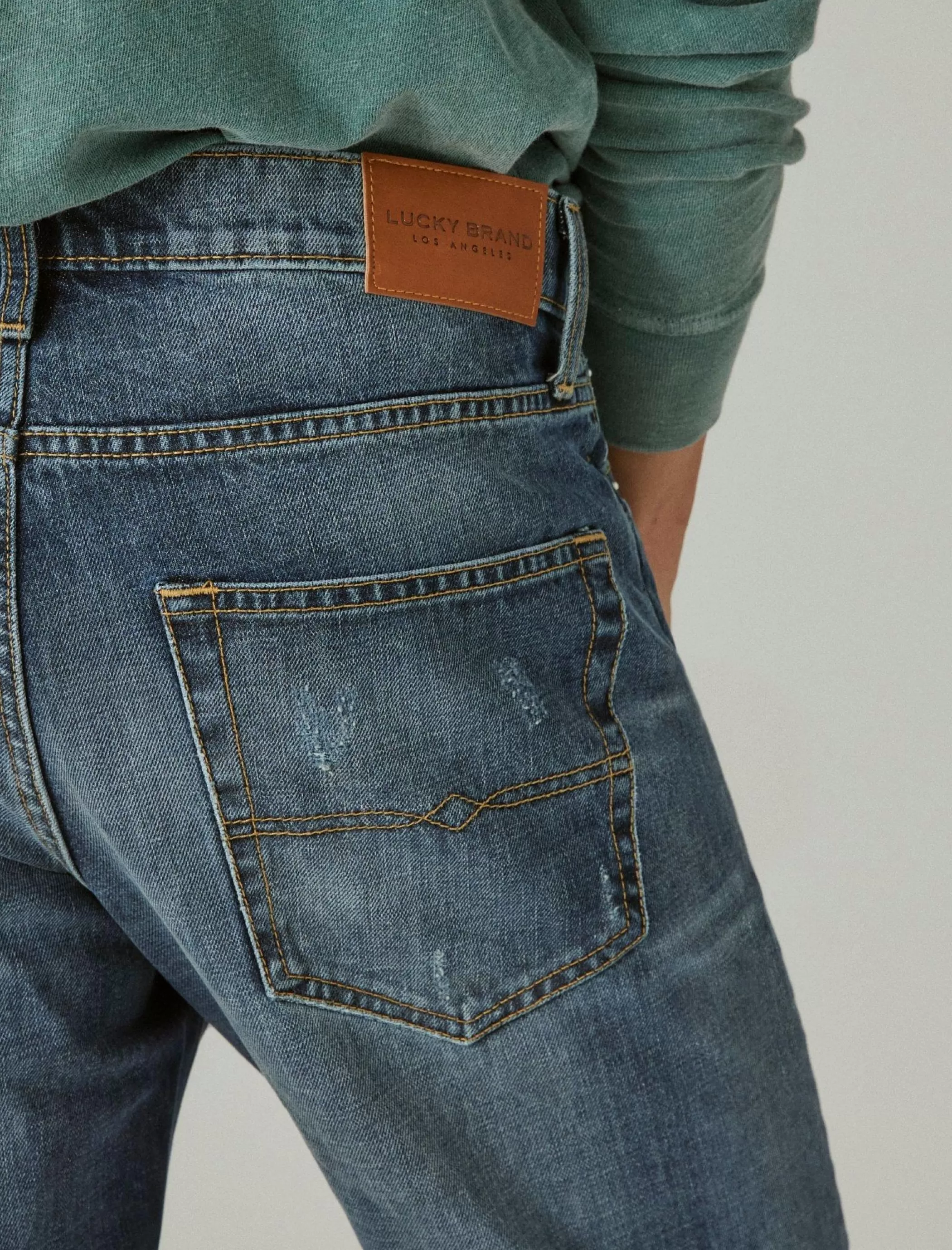 - Distressed medium vintage wash denim