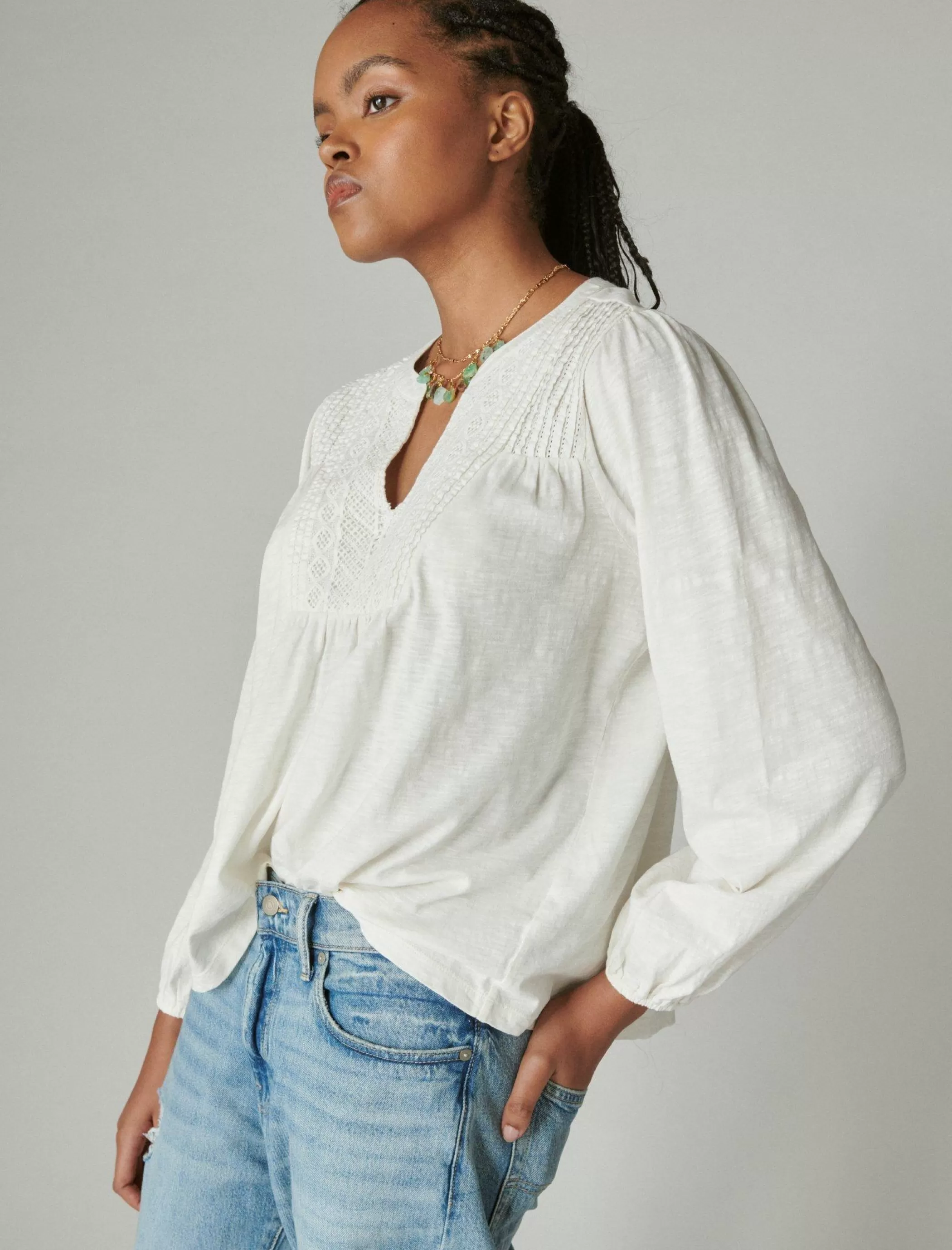 Versatile for any look, this peasant-style top shows off so pretty lace and pintuck details at the flattering split neckline.