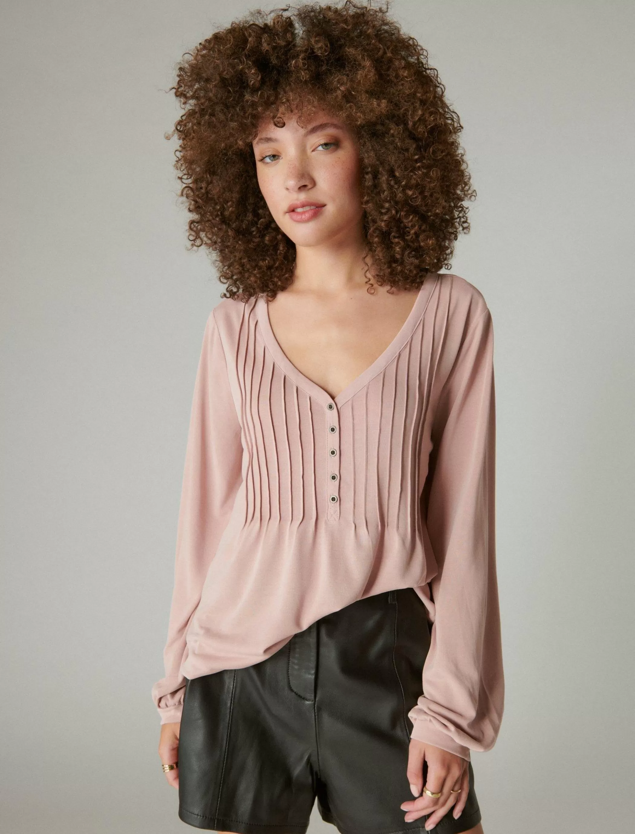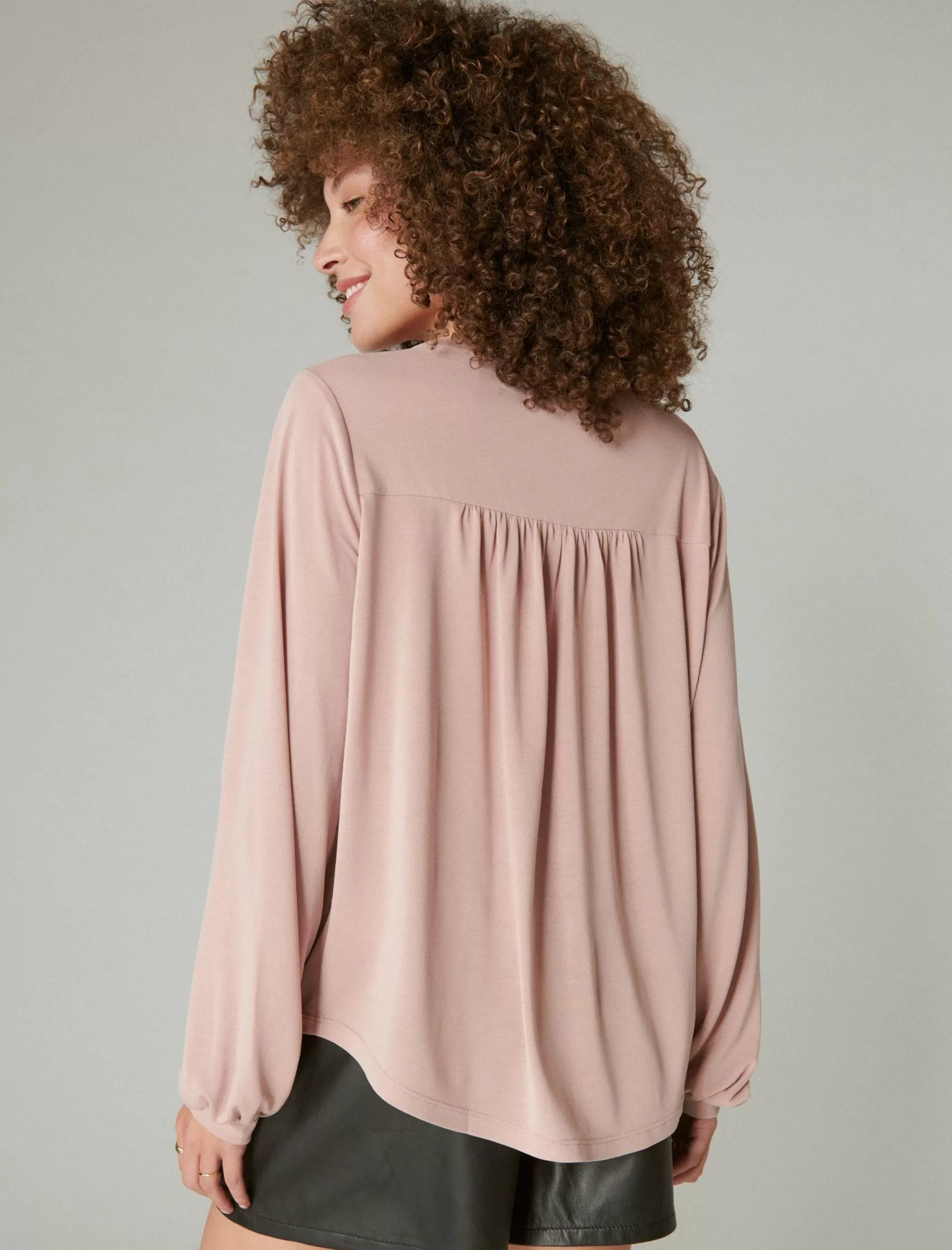 Spun from our super soft and stretchy sandwash fabric, this drapey long sleeve top has pretty pintuck details and a button placket at the front.
