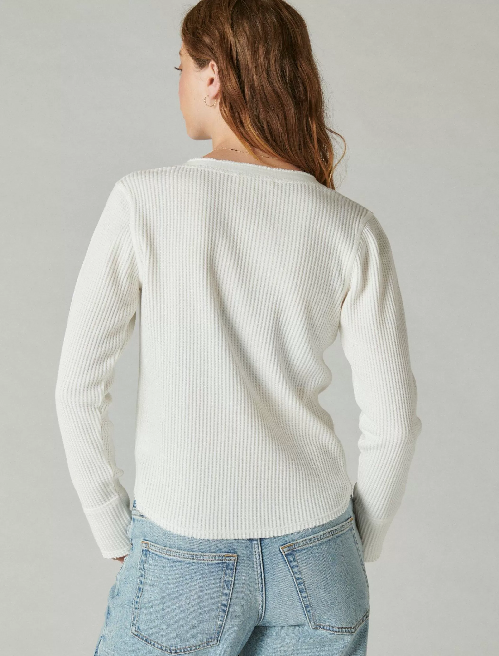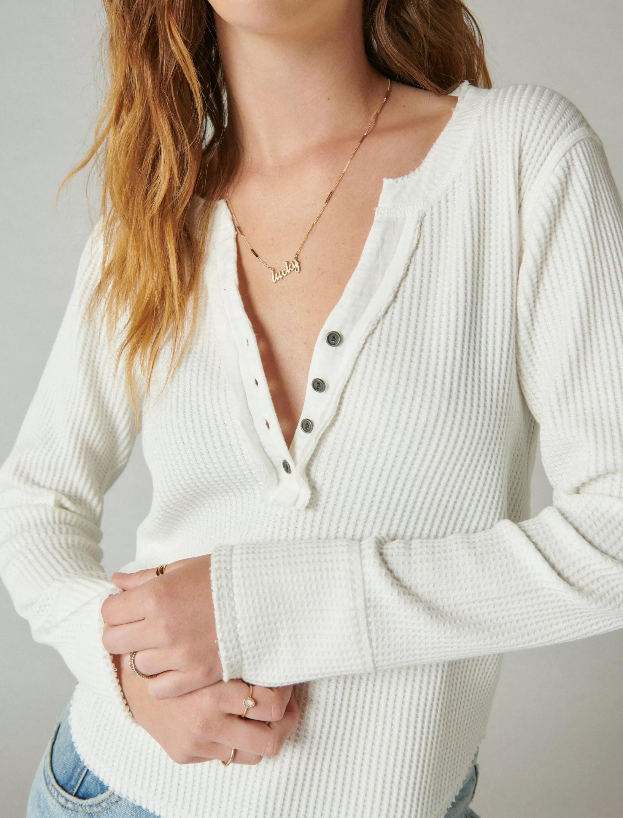 Perfectly cropped for easy pairing with your fave high waisted jeans, this long sleeve henley top keeps your look cute and casual thanks to its waffle-knit fabric and raw edge details throughout.