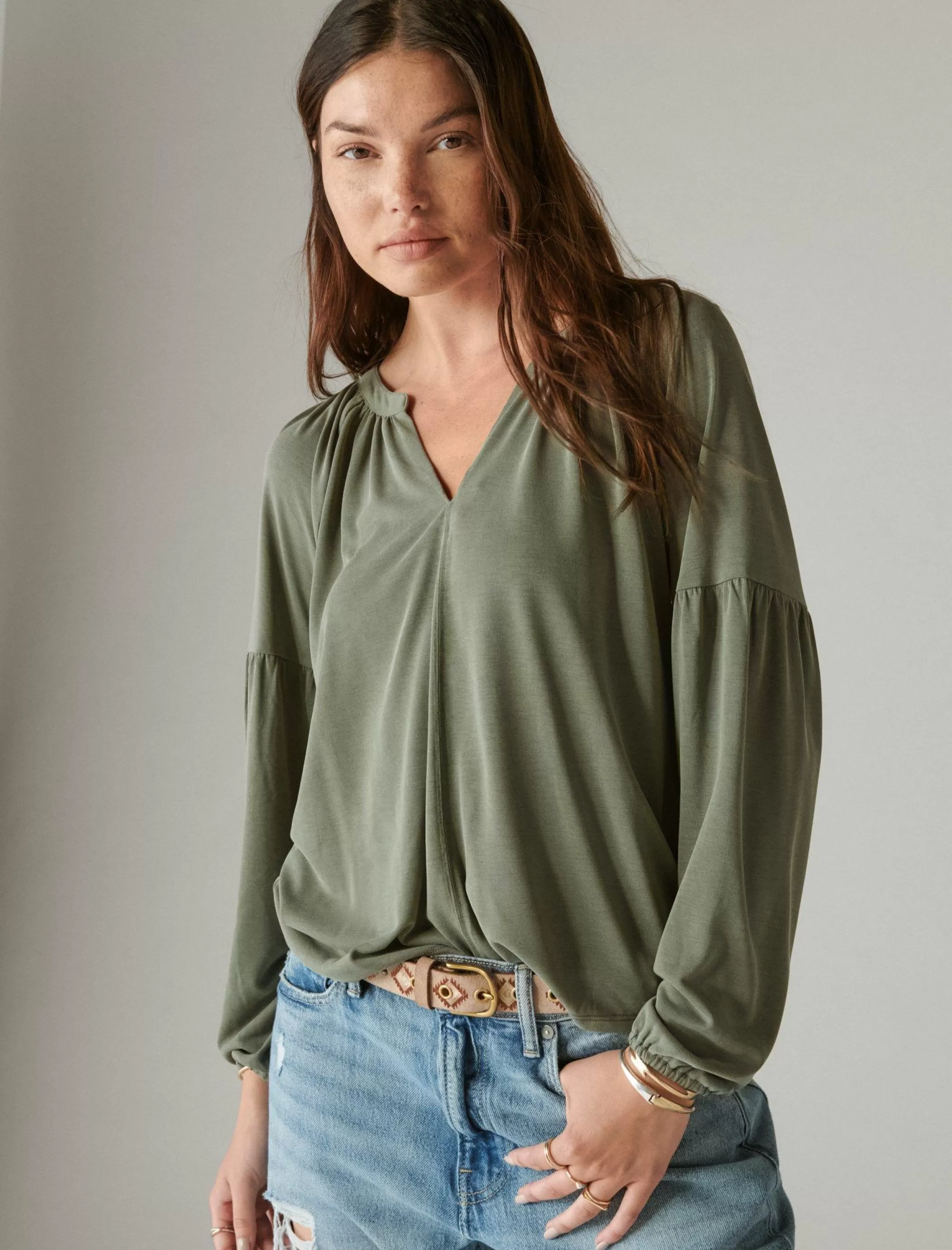 Spun from our super soft and stretchy sandwash fabric, this top has a notch neckline and long raglan-like sleeves in ran…