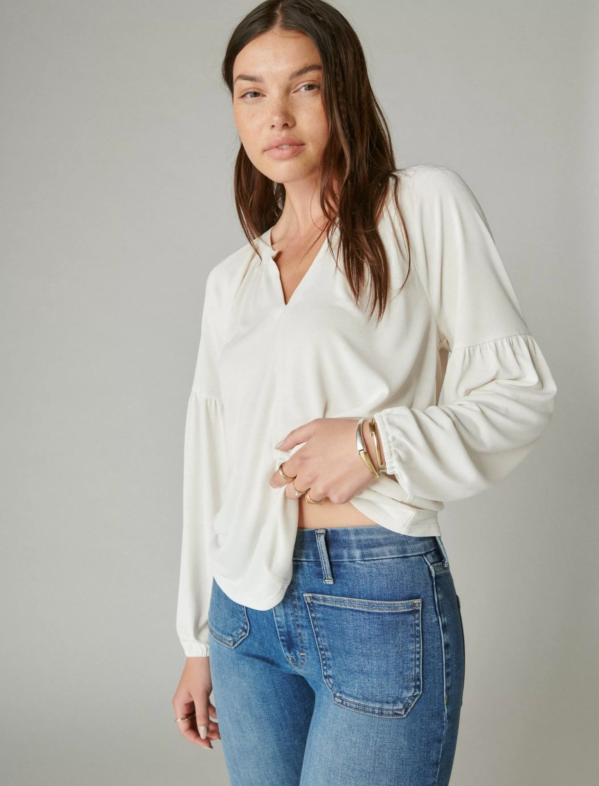 Spun from our super soft and stretchy sandwash fabric, this top has a notch neckline and long raglan-like sleeves in range of wear-with-everything colors perfect for the cool-weather season.