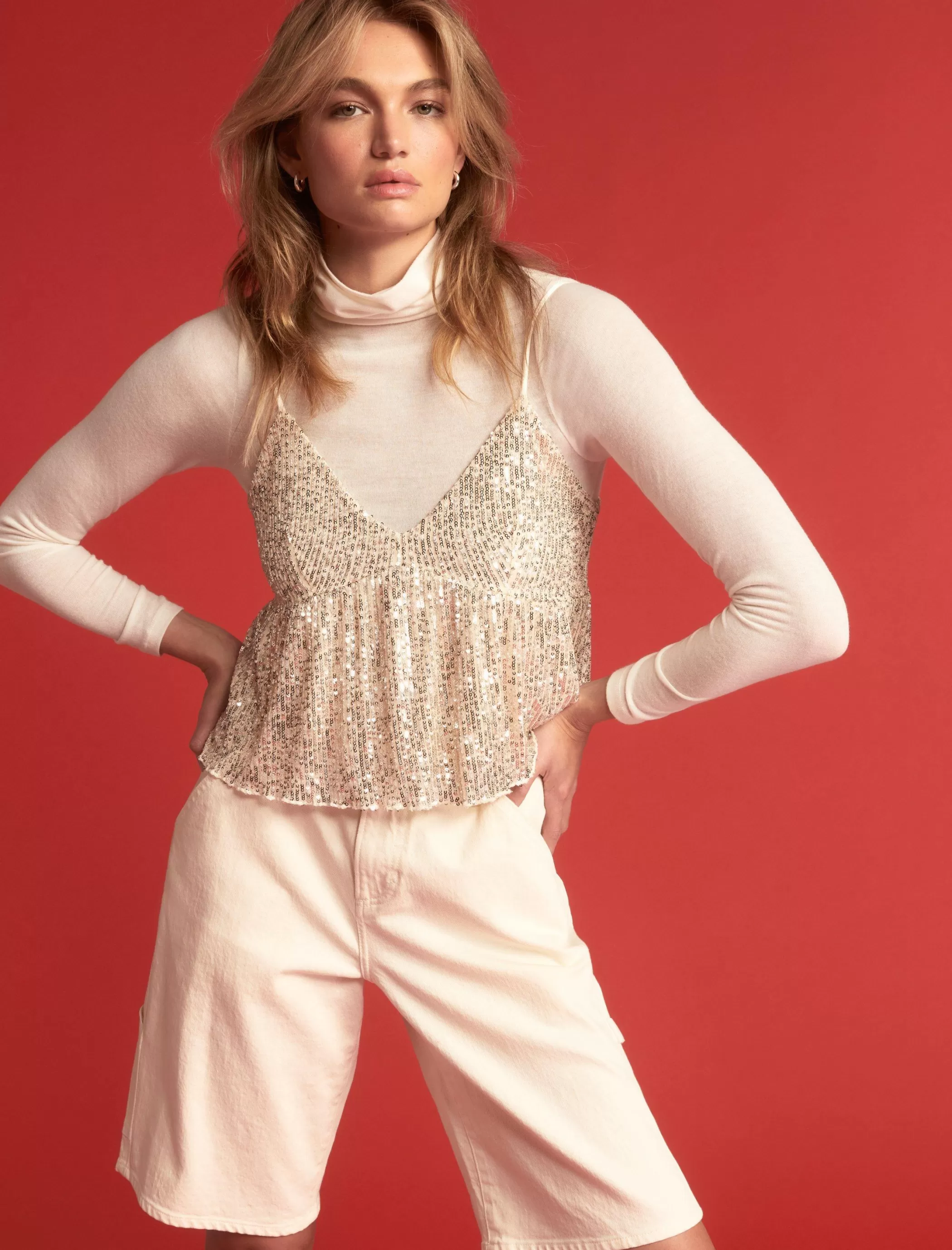 You don’t need a special occasion to wear this sparkly number. So pretty and shimmery, this sequin mini top pairs effort…