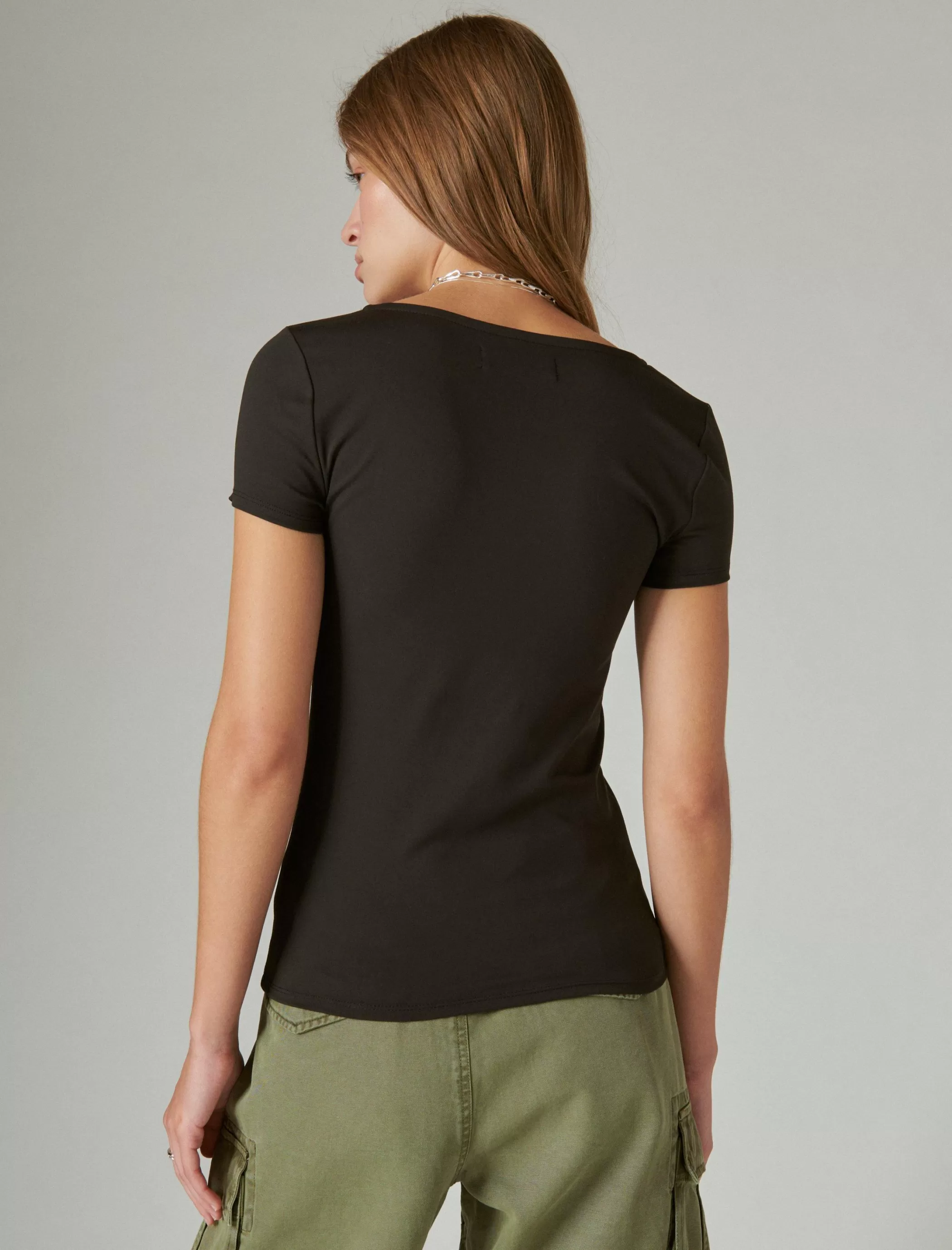The soft, stretchy knit fabric and flattering square neckline make this seamless top a must-have style for your everyday wardrobe.