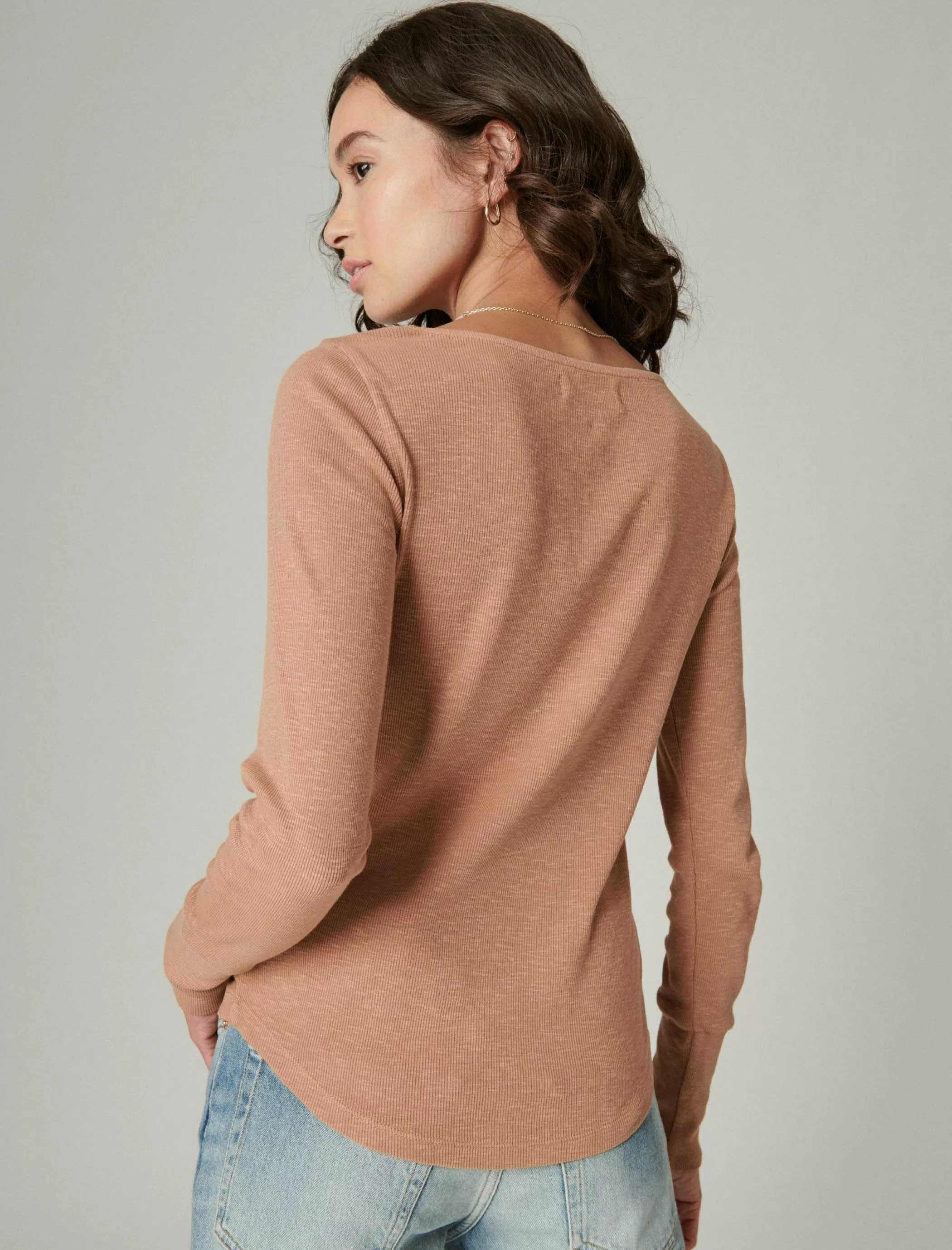 Go from day to night with this long sleeve henley top featuring a buttoned front and so pretty lace and embroidered details at the chest.