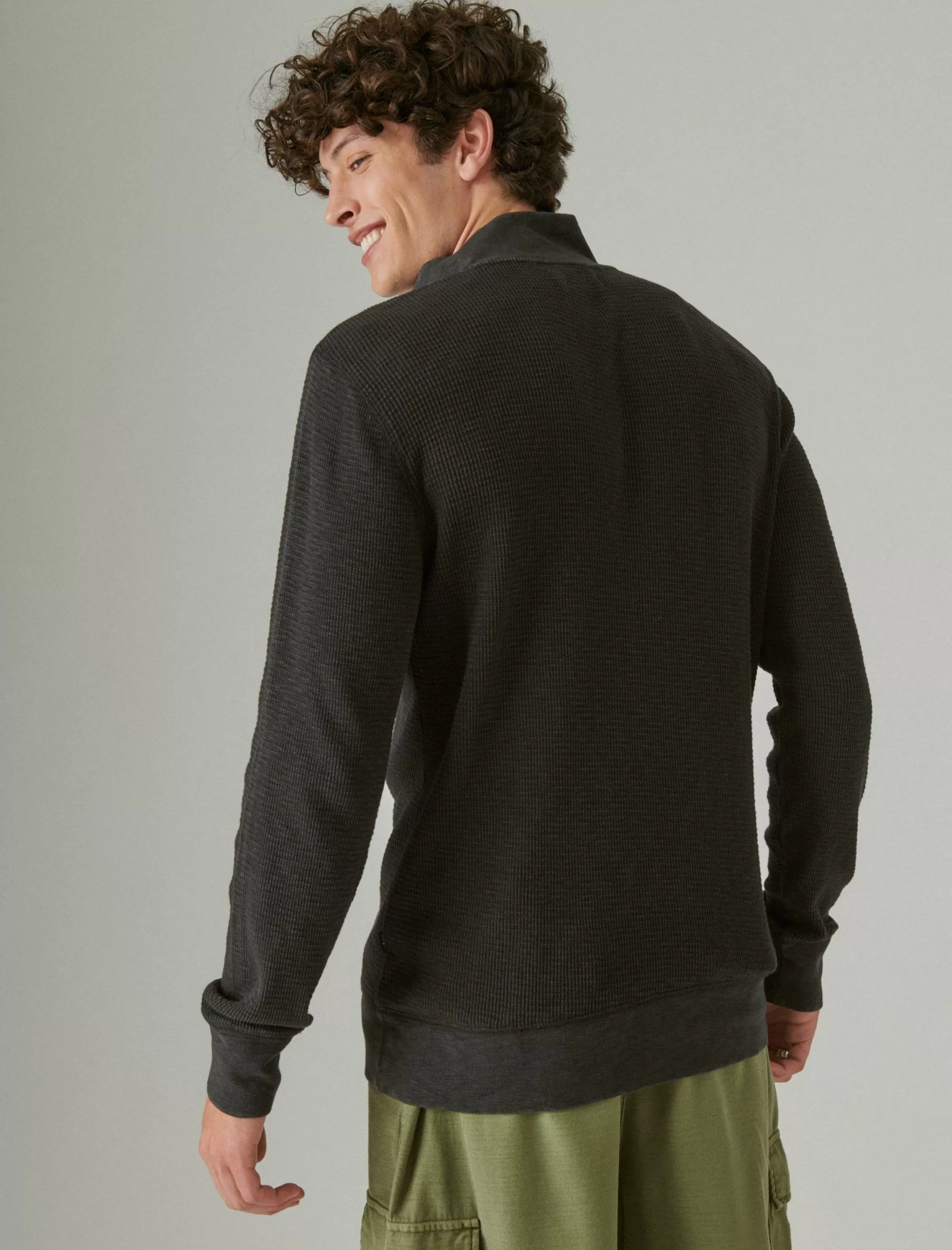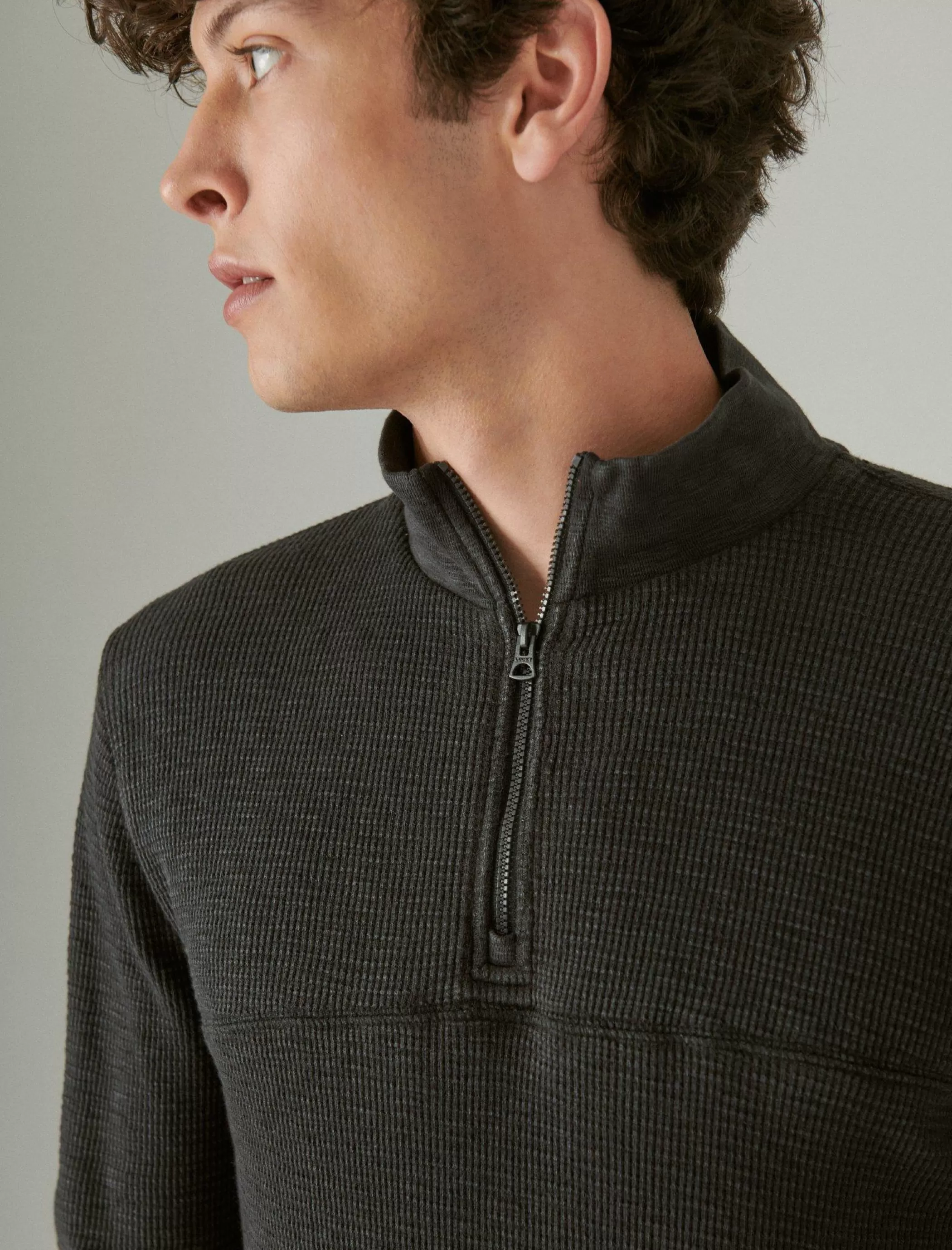 Knit from garment dyed cotton for a soft feel, this cozy thermal pullover keeps your look casual and cool with a classic mock neck and half-zip front.