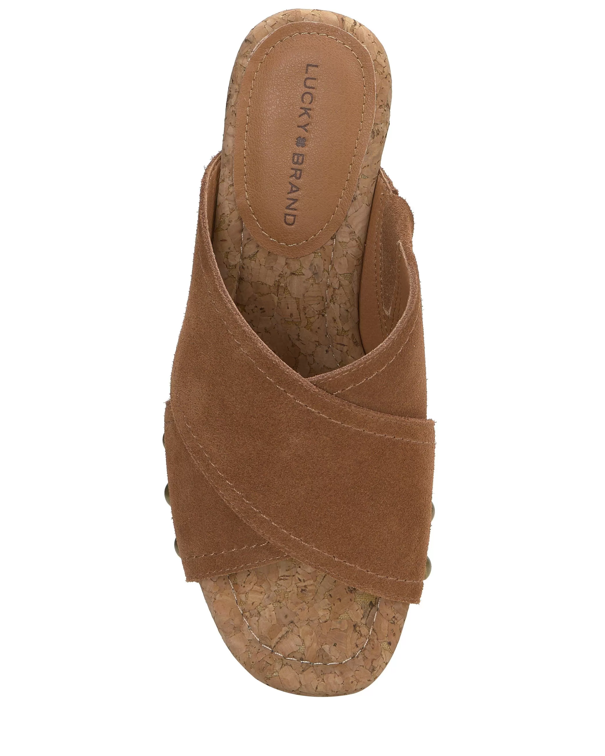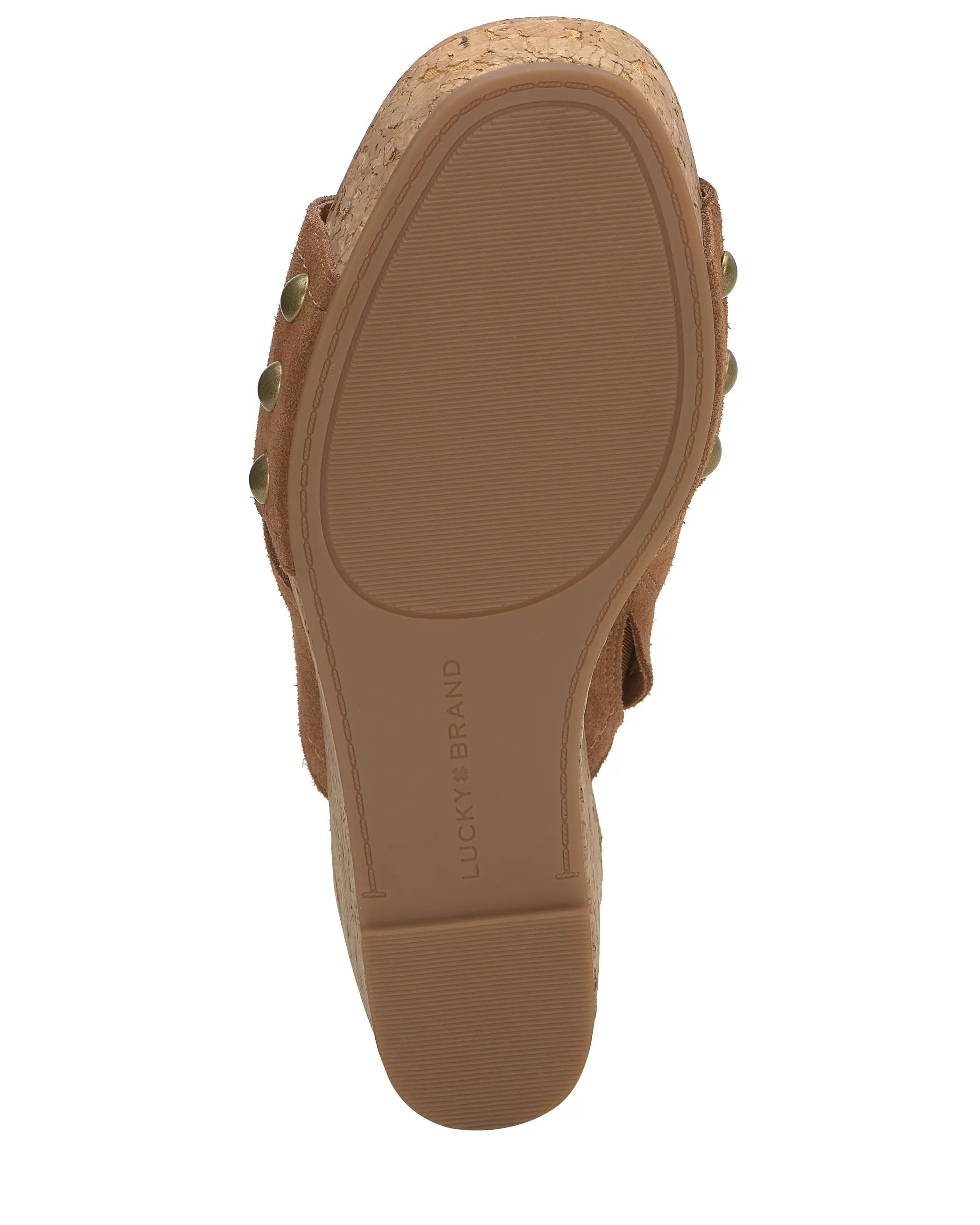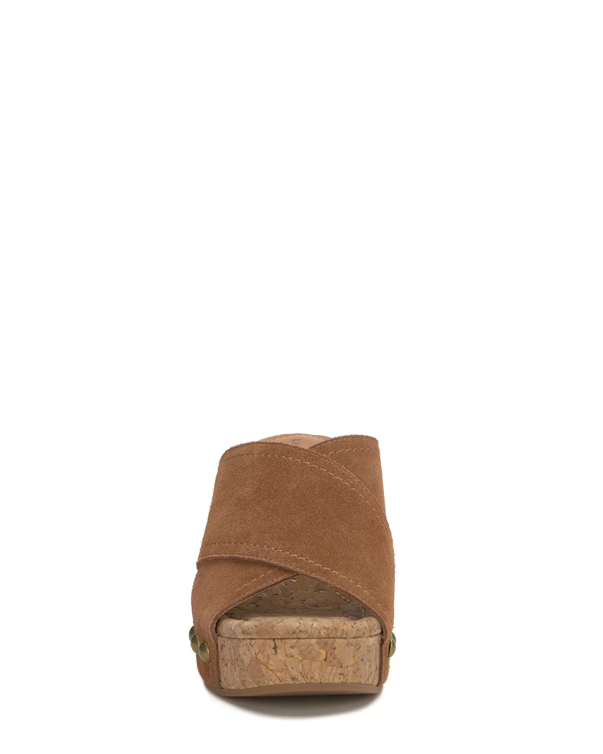 Set atop an elevated cork platform, the Valmai wedge sandal shows off leather criss cross straps punctured with shiny gold-tone studs.