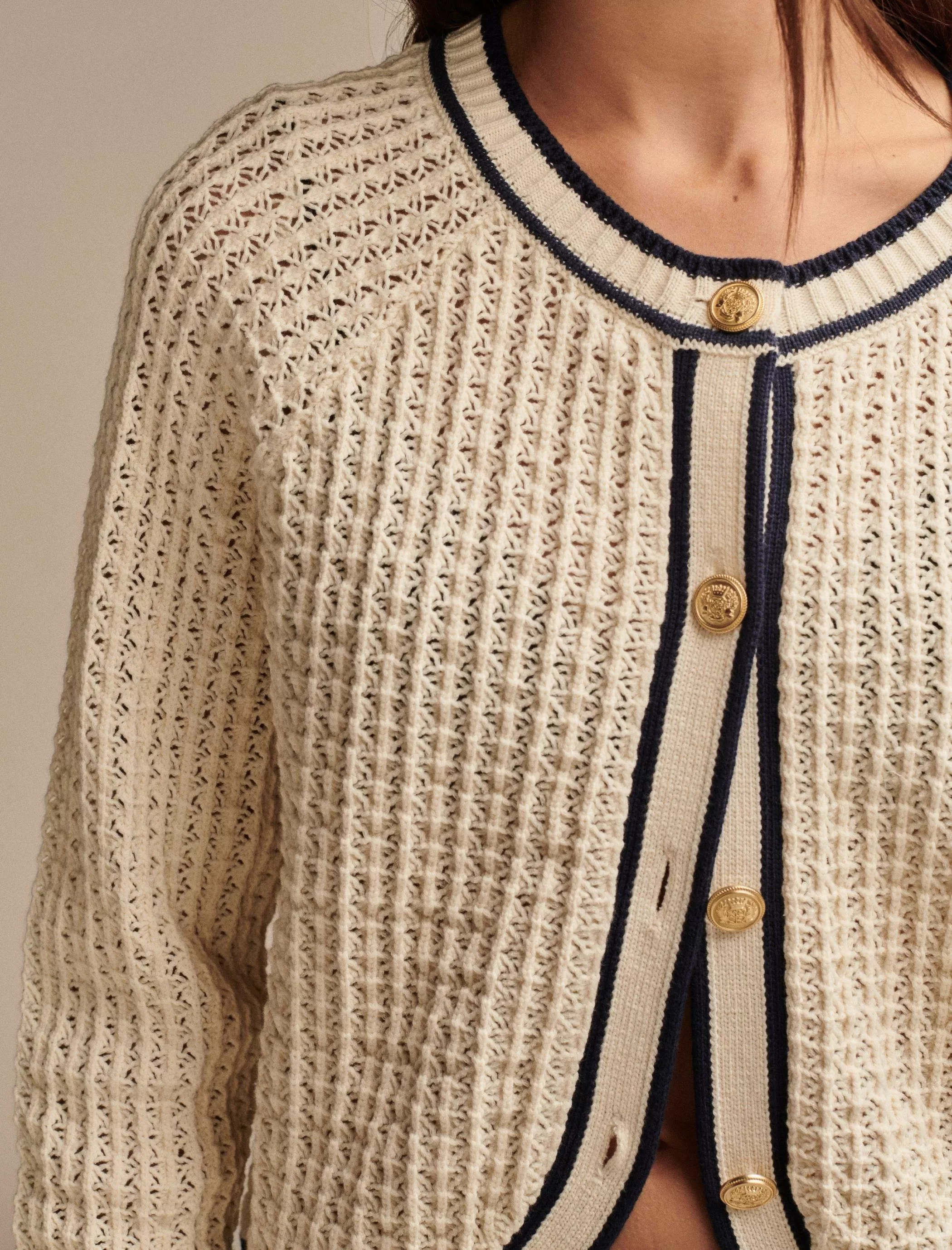 Crafted from soft cotton-knit, this sweater jacket features button down styling with gold-tone hardware and contrast tri…