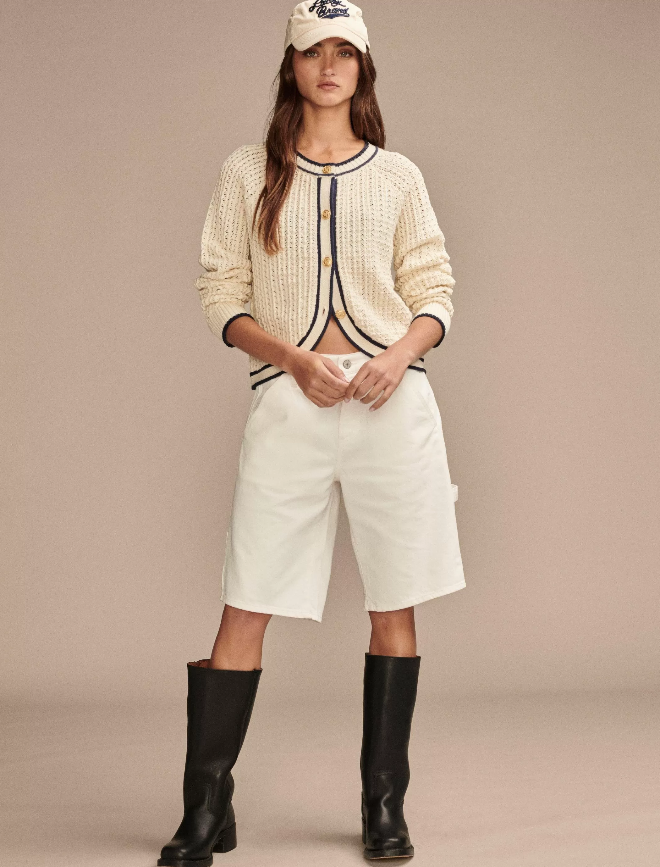 Crafted from soft cotton-knit, this sweater jacket features button down styling with gold-tone hardware and contrast trim detailing for a varsity-like look.