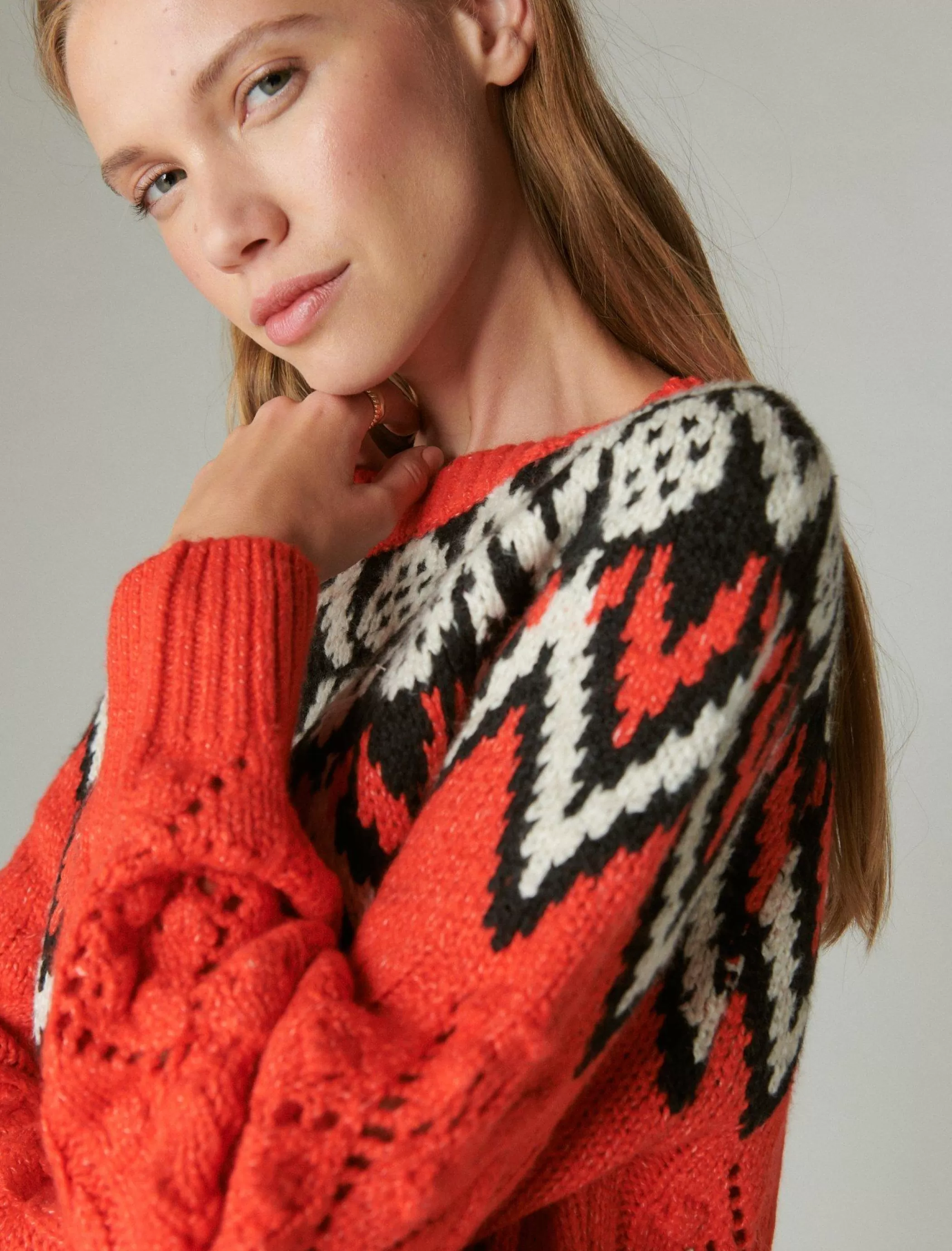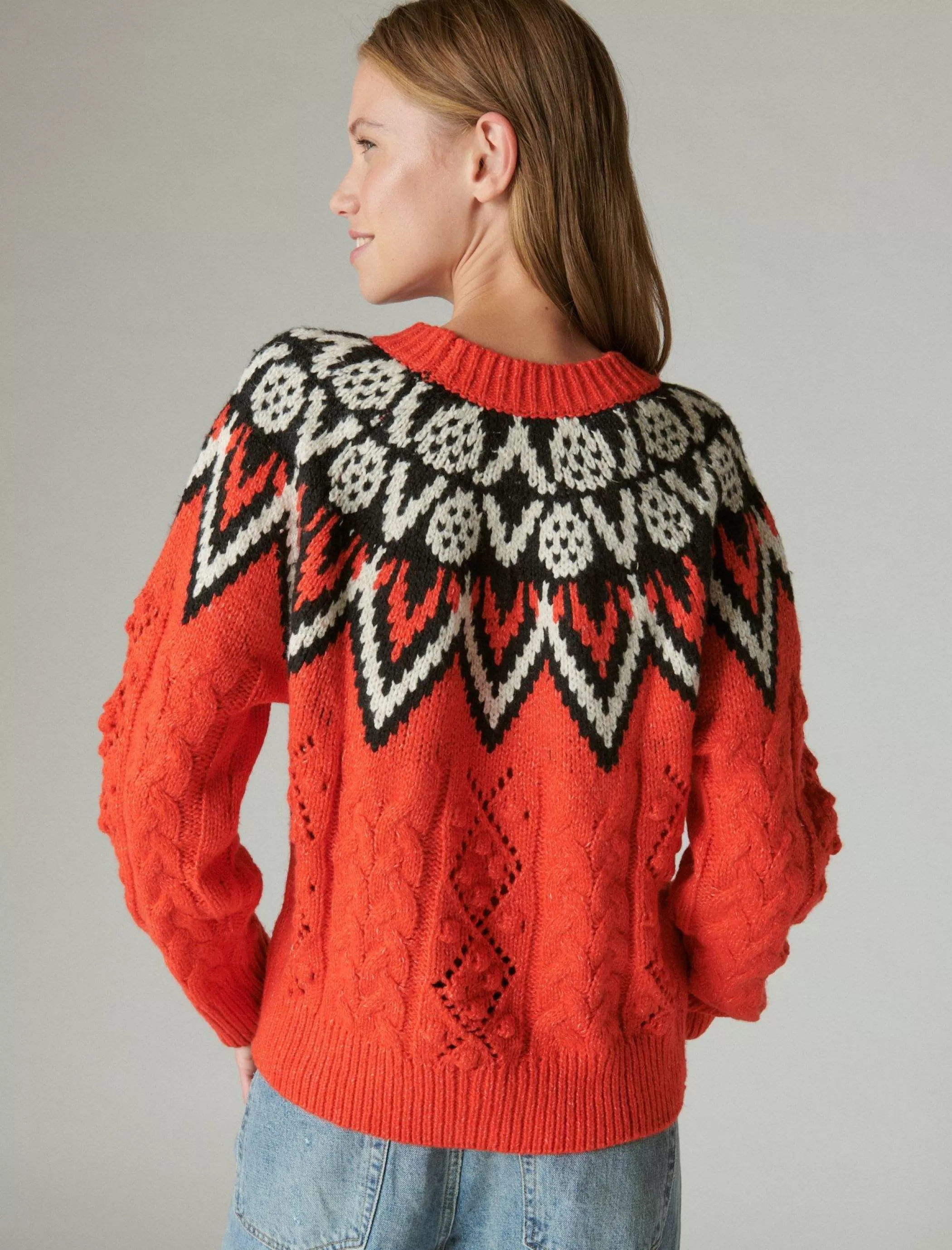 The festive Fair Isle pattern and chunky cable-knit design make this crewneck sweater a must-have for your cool-weather wardrobe.