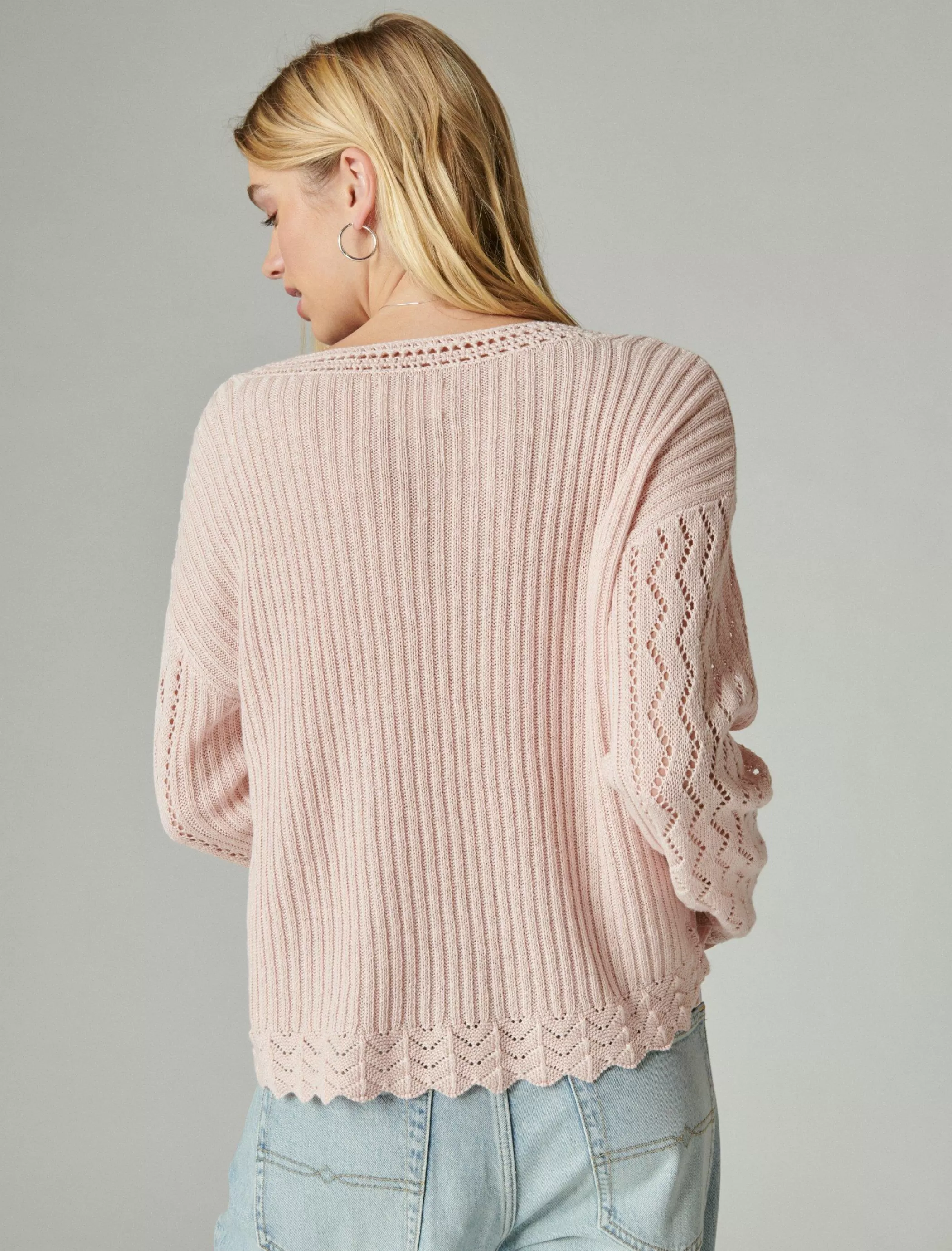 Small details make this V-neck sweater extra special. Made of soft linen-cotton fabric, it shows off zig zag patterning, cut out details and a so stunning scallop edged hem.