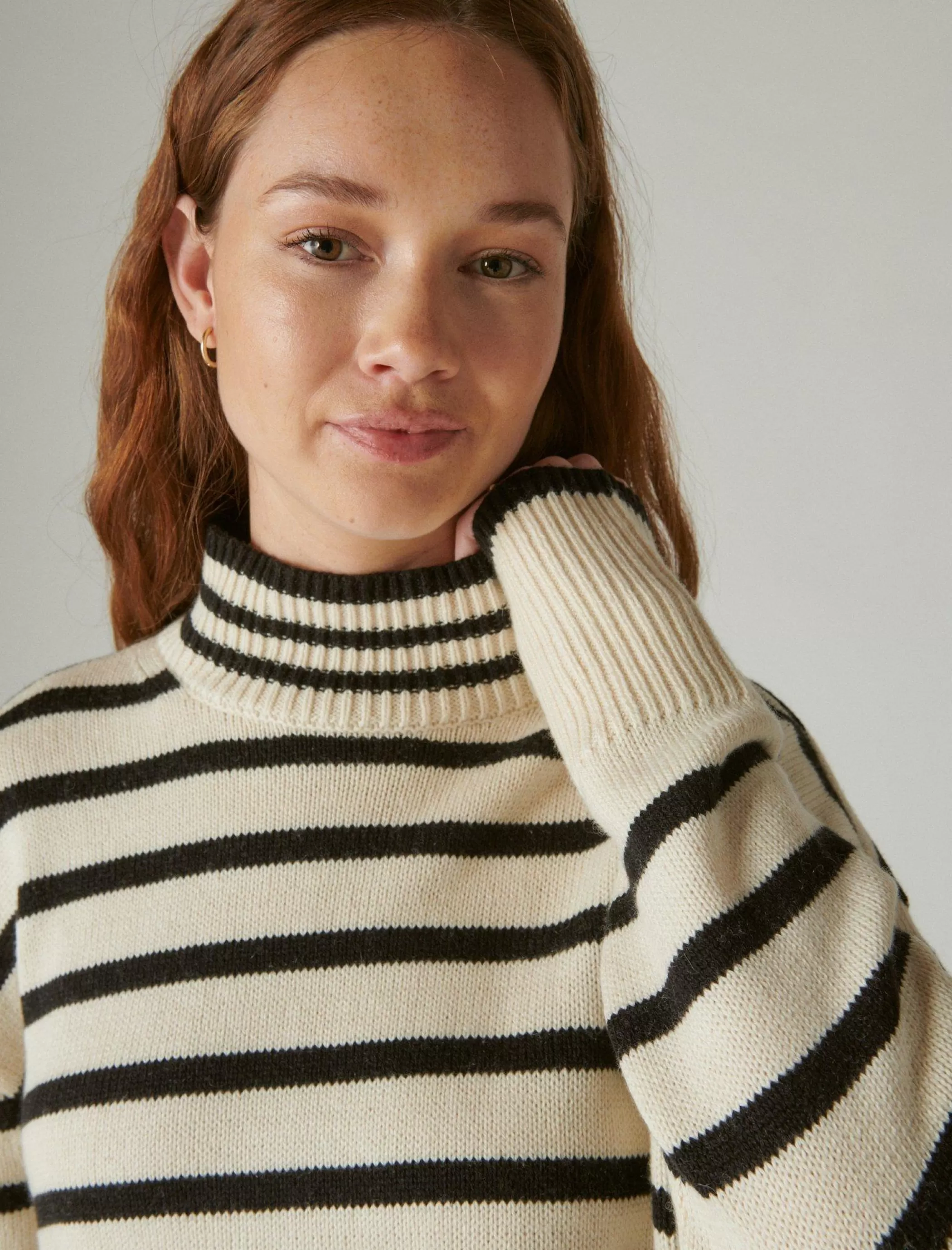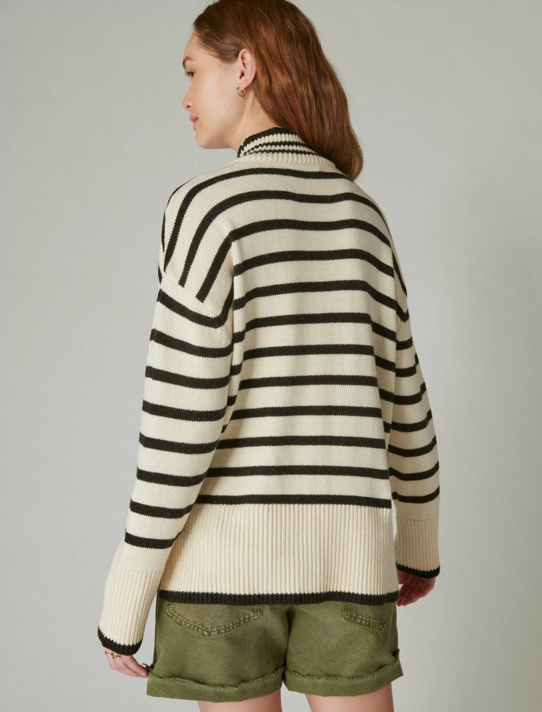 Chilly days calls for this cozy long sleeve top. Spun from soft, recycled cotton-knit, this striped style has a comfy mock neck and ribbed details in a long, tunic silhouette.