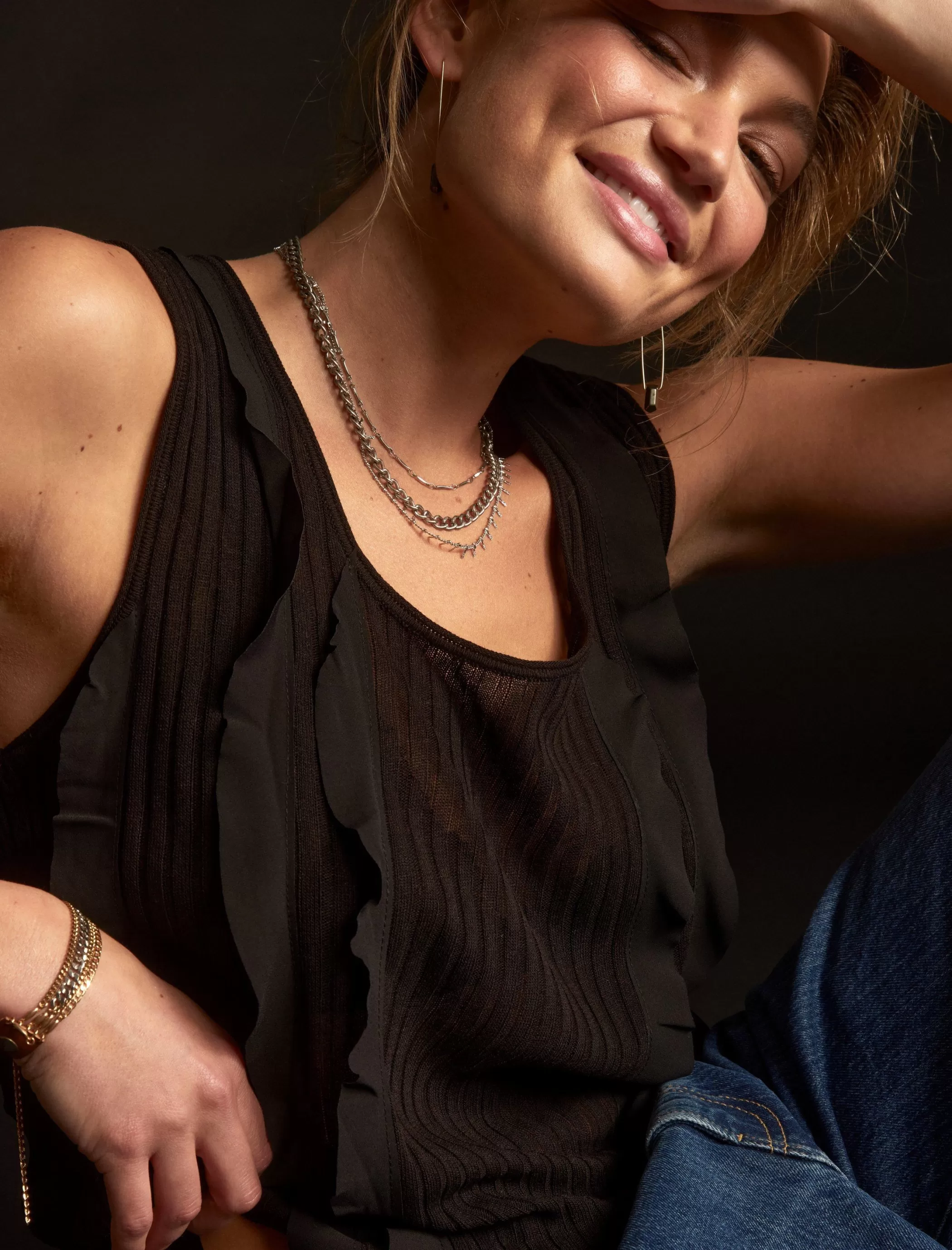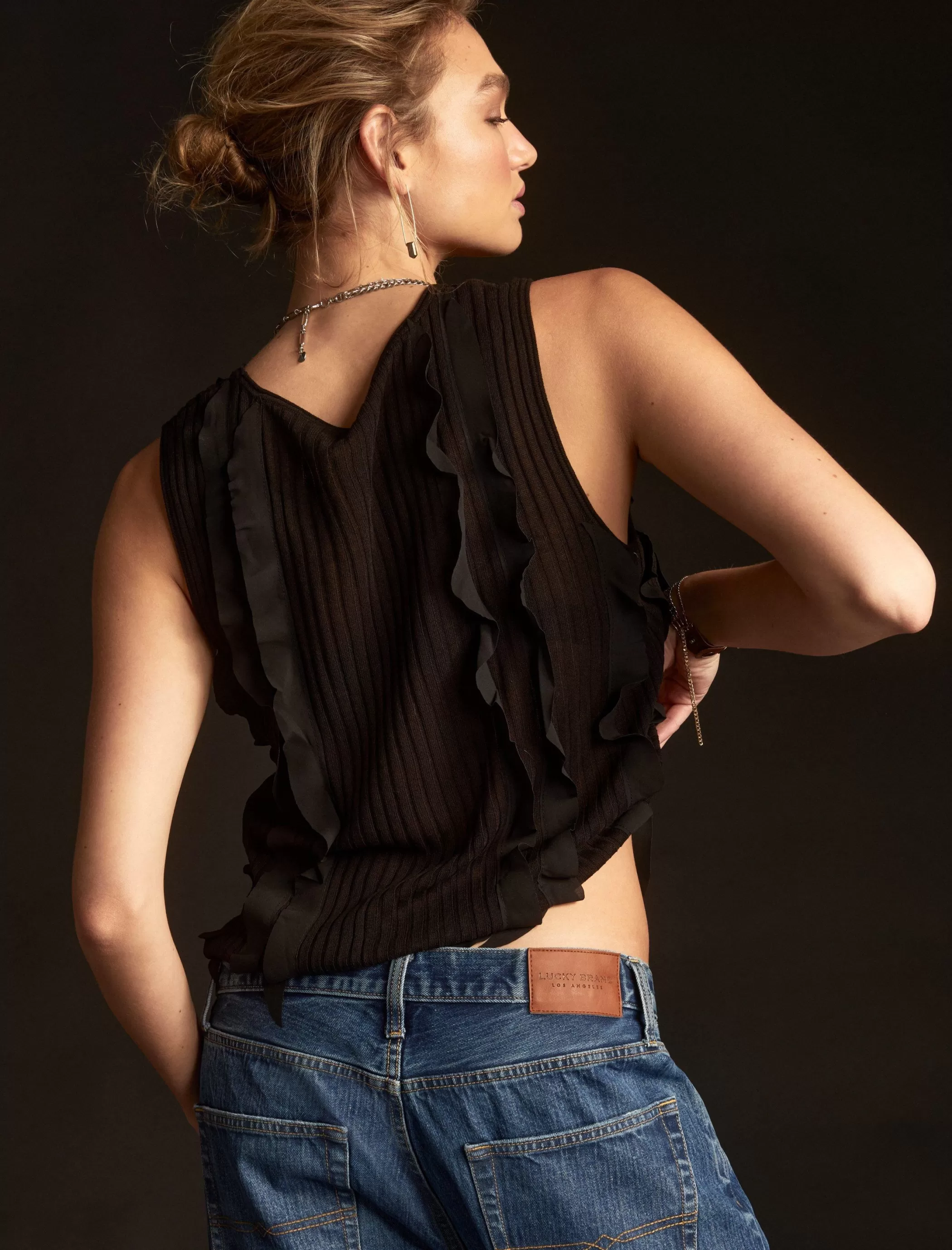 Mix up your look with this so cute sweater tank designed with a rib-knit bodice and pretty ruffles down the front, sides and back. Pair with your fave Lucky jeans and a moto jacket or cardigan to complete the ‘fit.