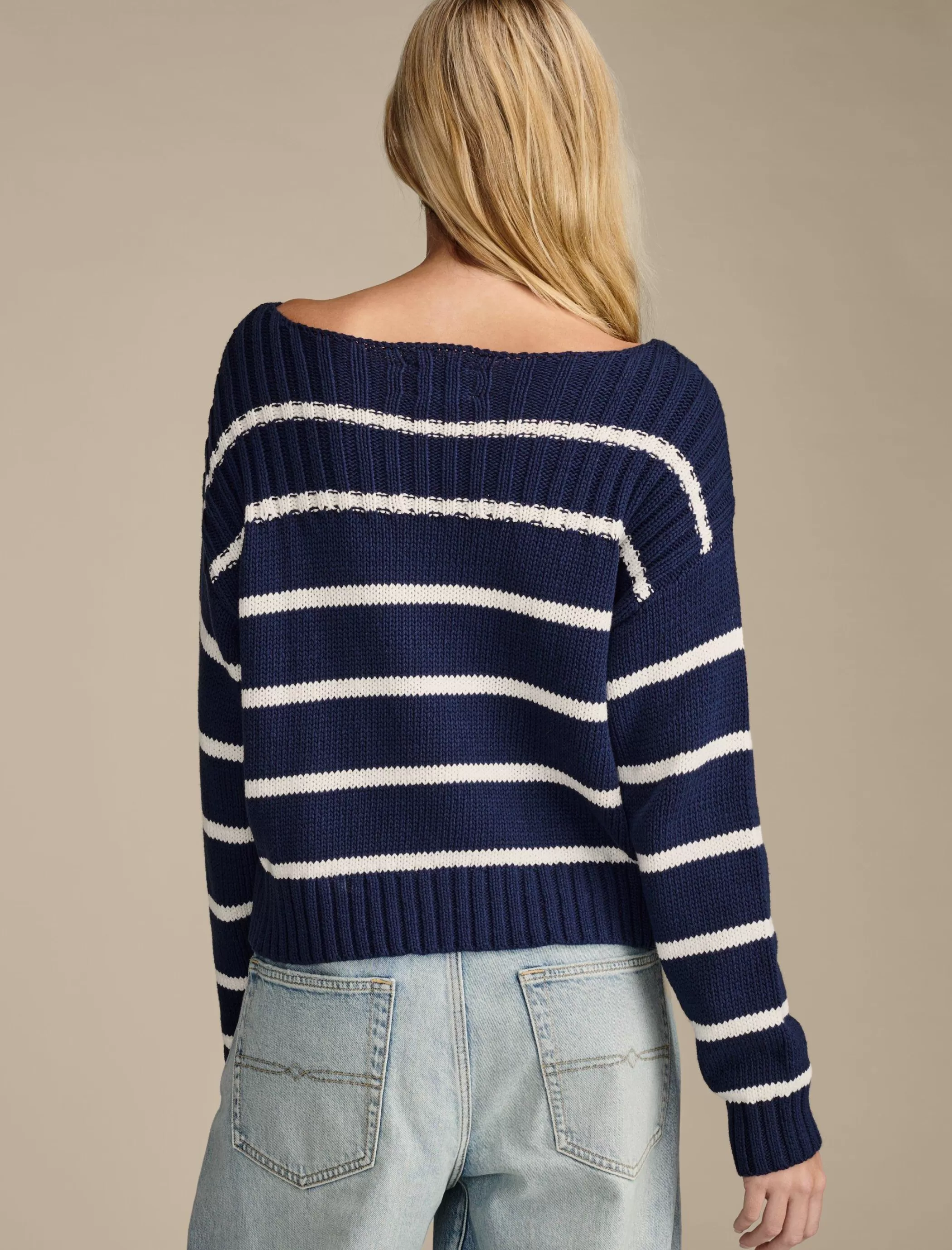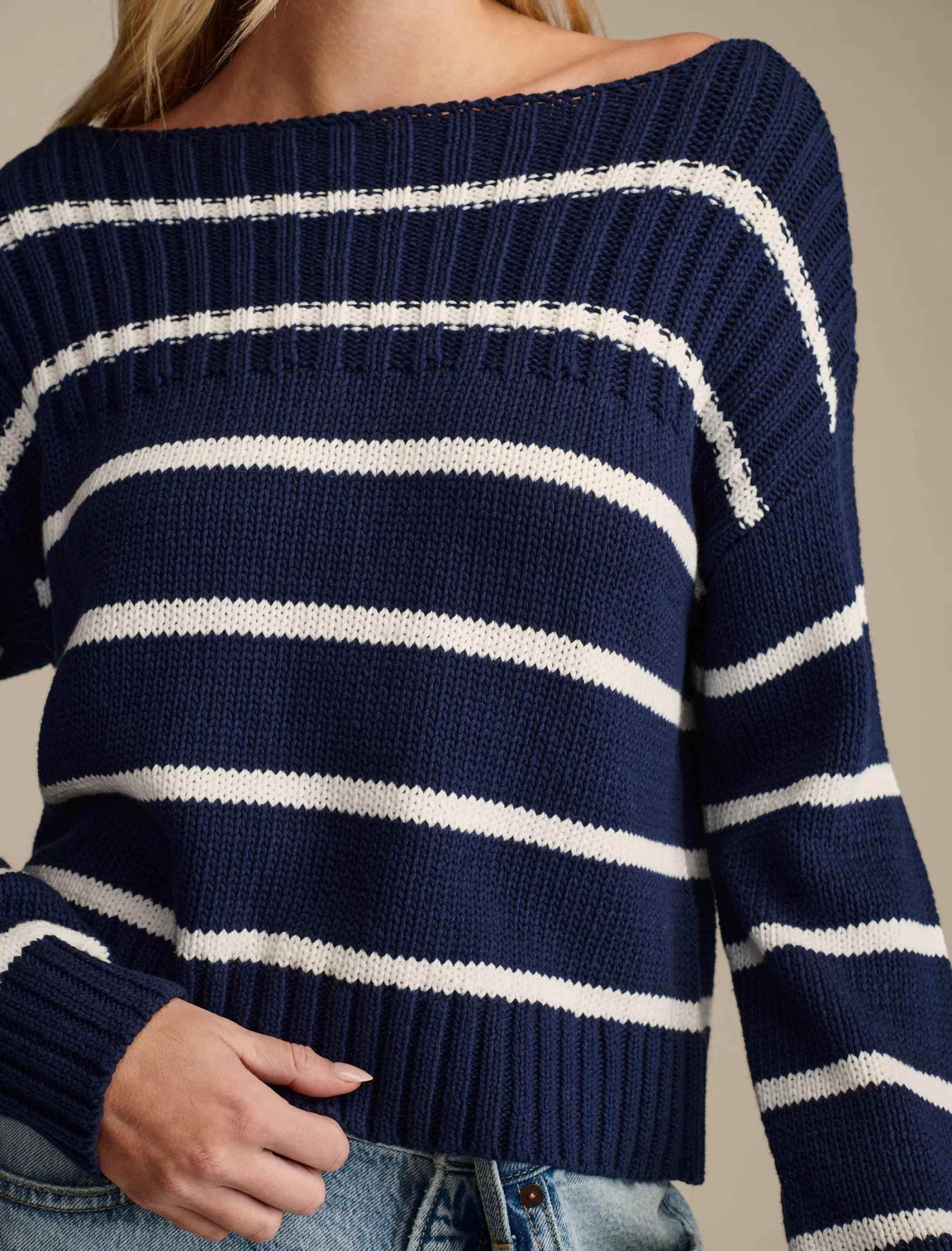 Crafted of one hundred percent cotton, this pullover sweater keeps it classic but cute with a stripe design, shoulder-skimming boat neckline and ribbed details for the perfect cozy look and feel.