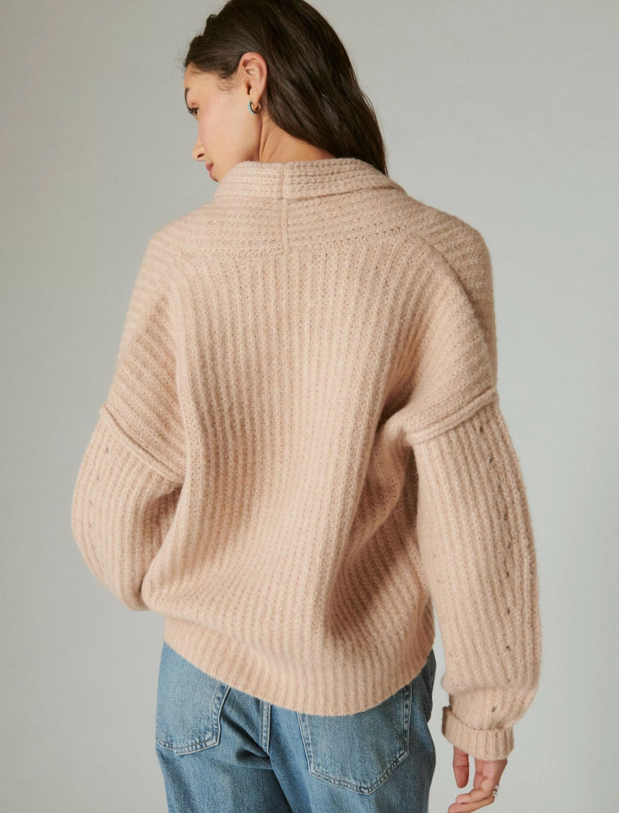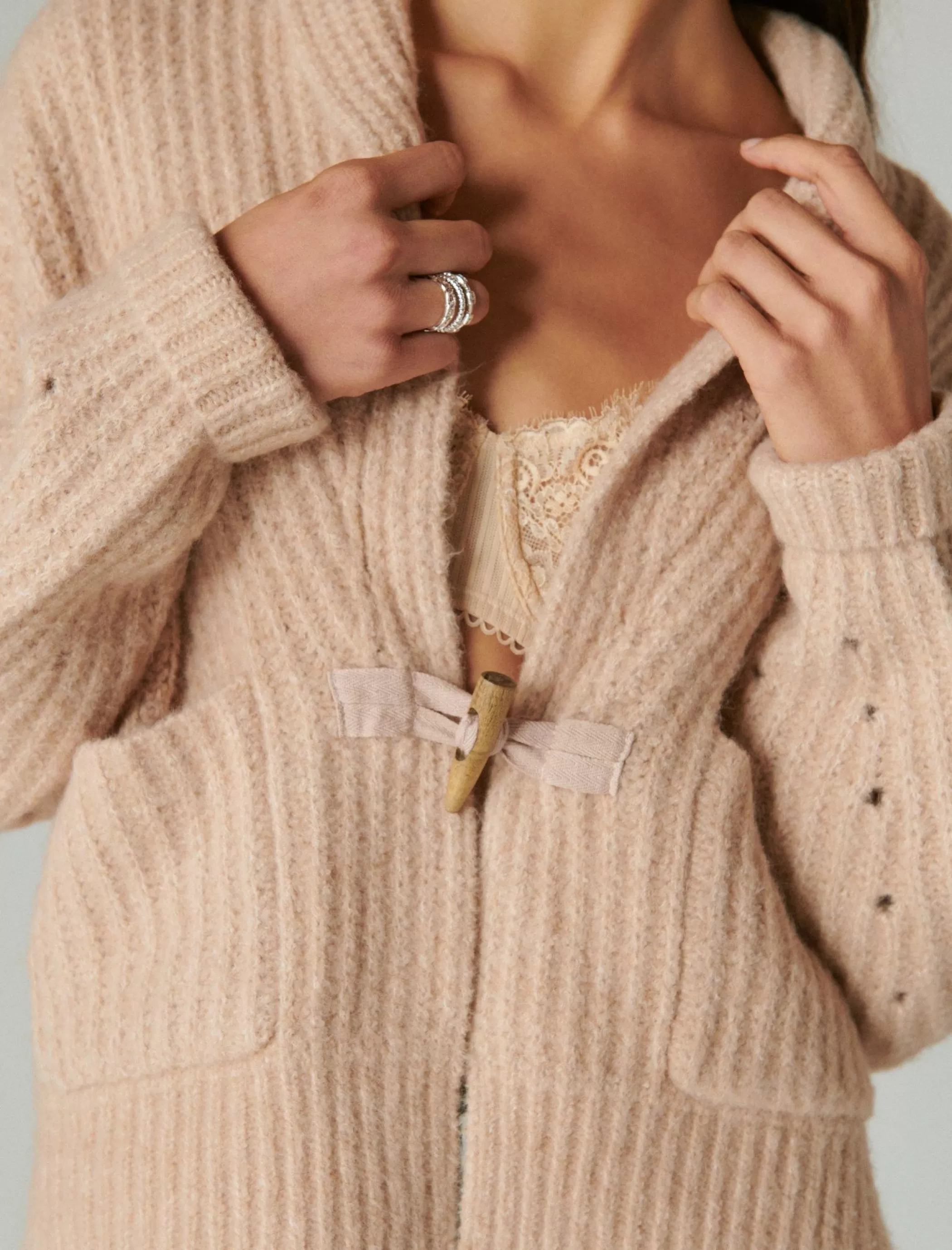Soft and cozy, this so pretty ‘cardi features a classic shawl collar, patch pockets and a unique toggle front.