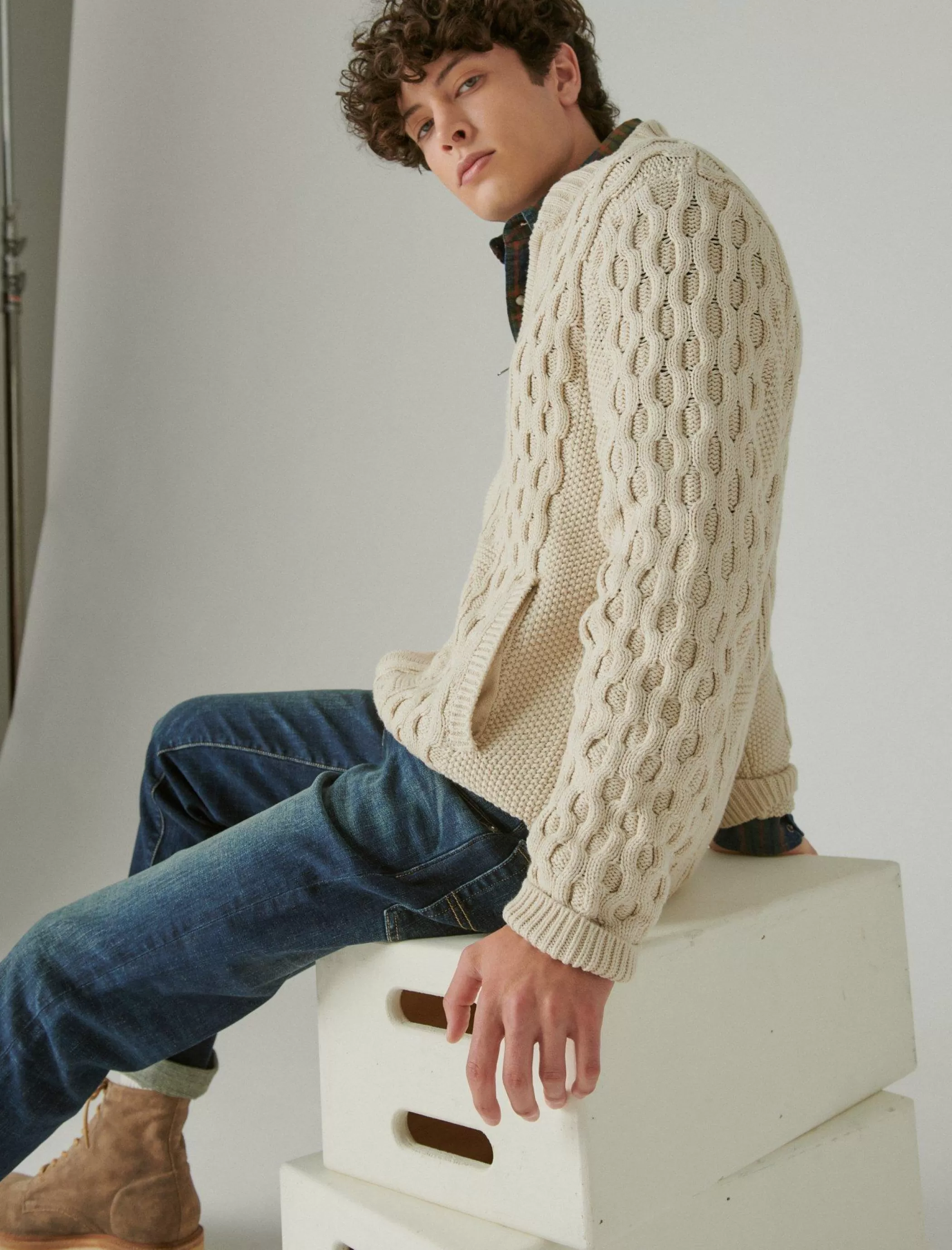 When the temps take a dip, layer on this cozy cable-knit cardigan featuring a full-zip front, side pockets and ribbed details.