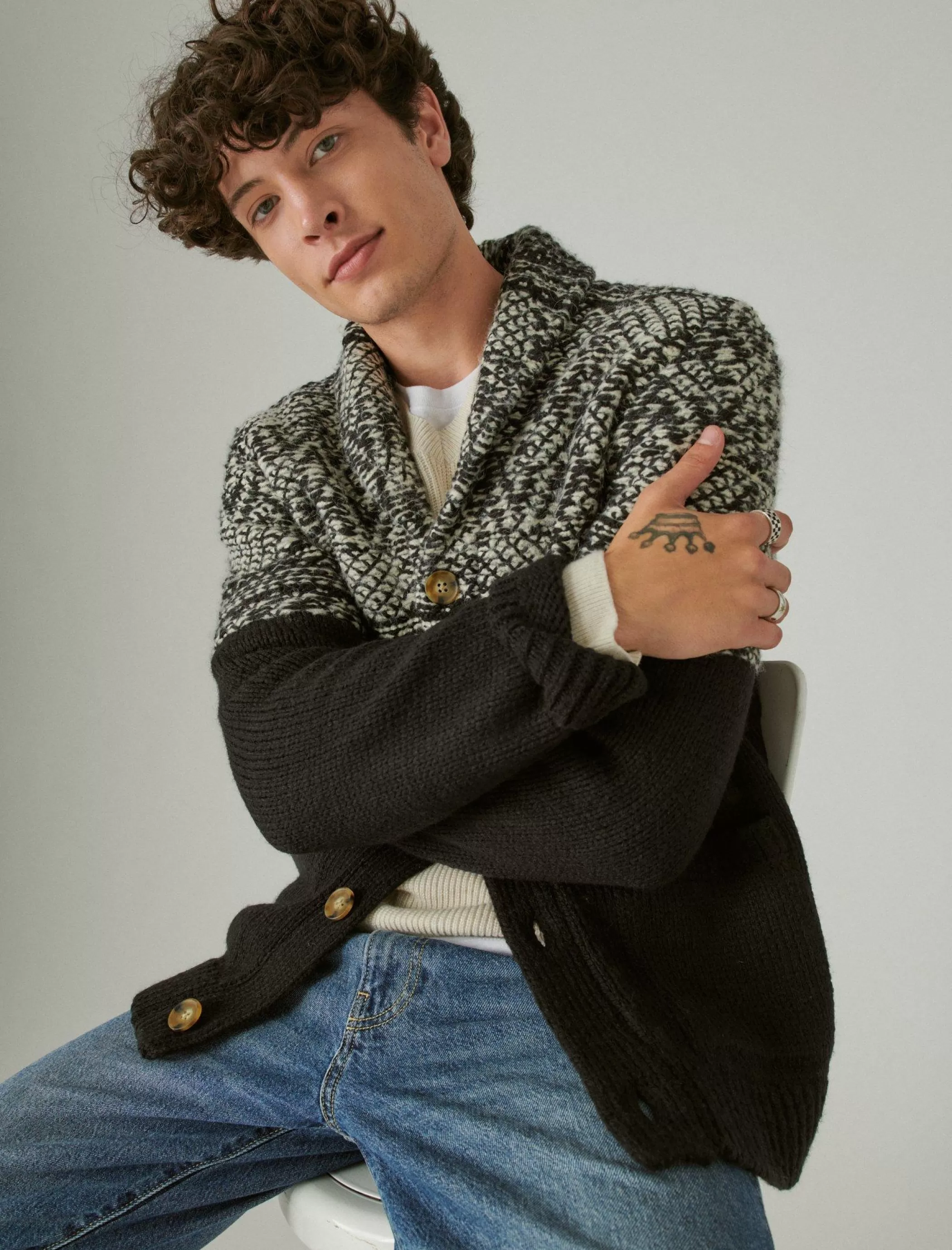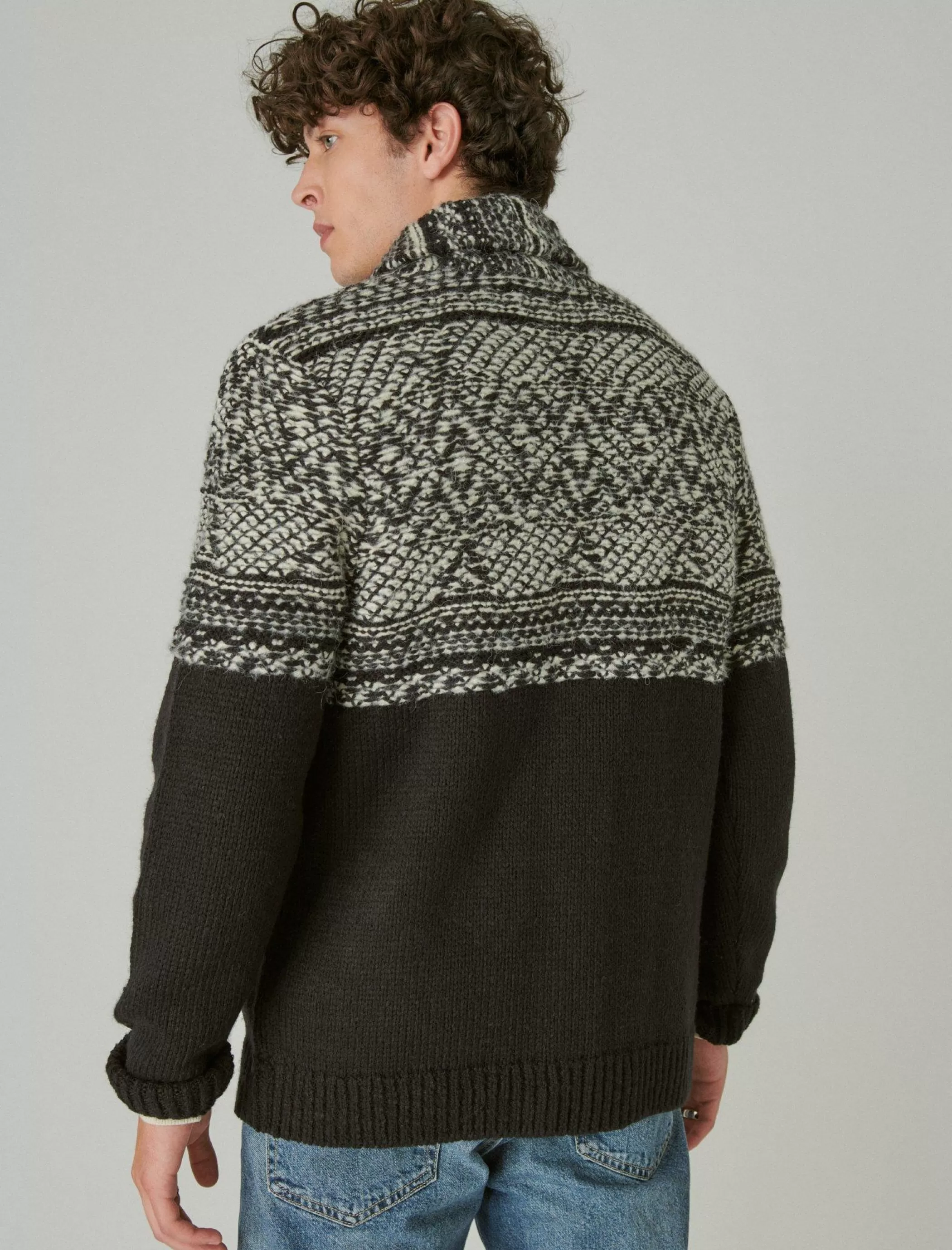Refresh your cool-weather wardrobe with this mixed media cardigan. Knit from a warm wool-blend, it features a classic shawl collar, button-down front and roomy patch pockets to stash your keys, wallet and phone.