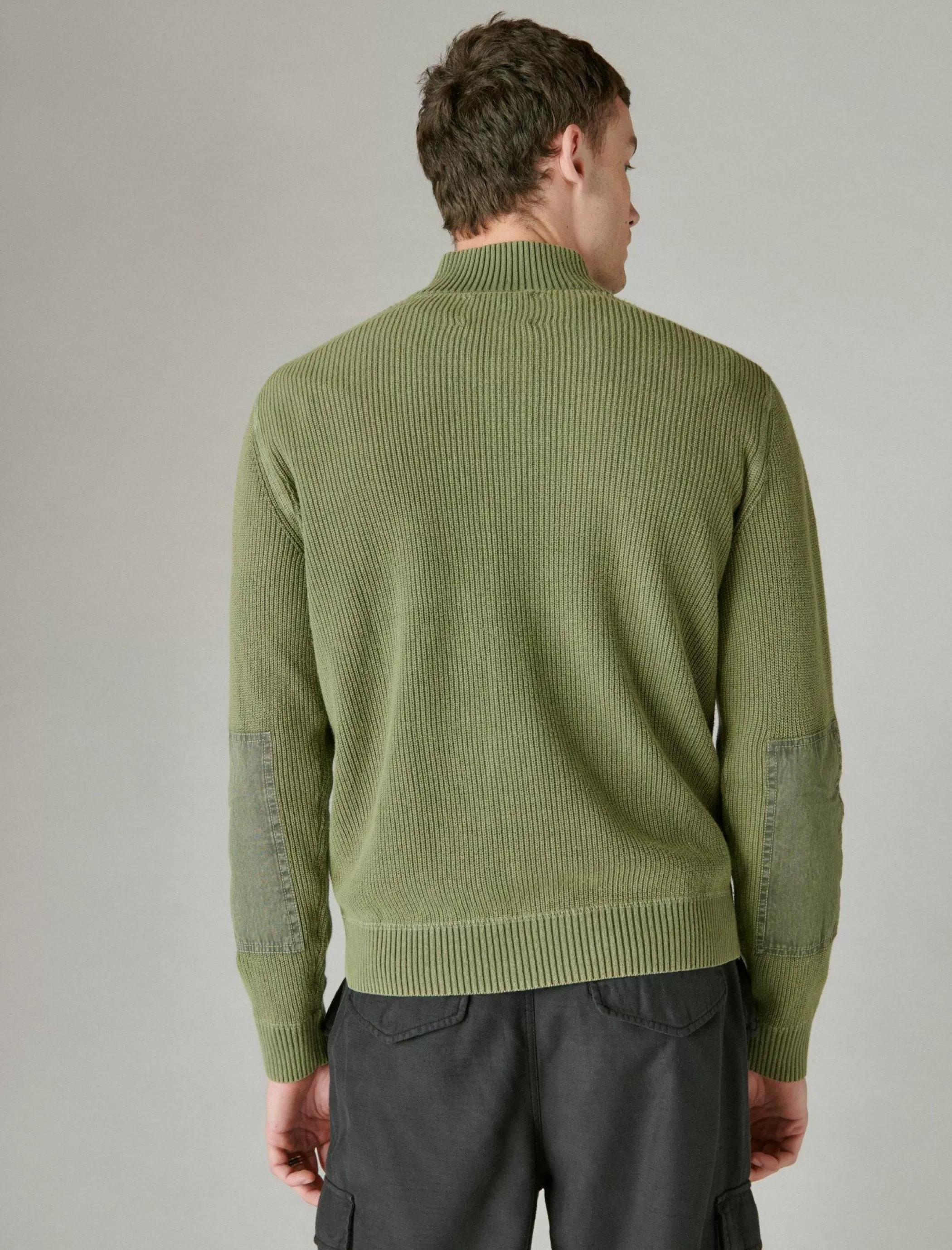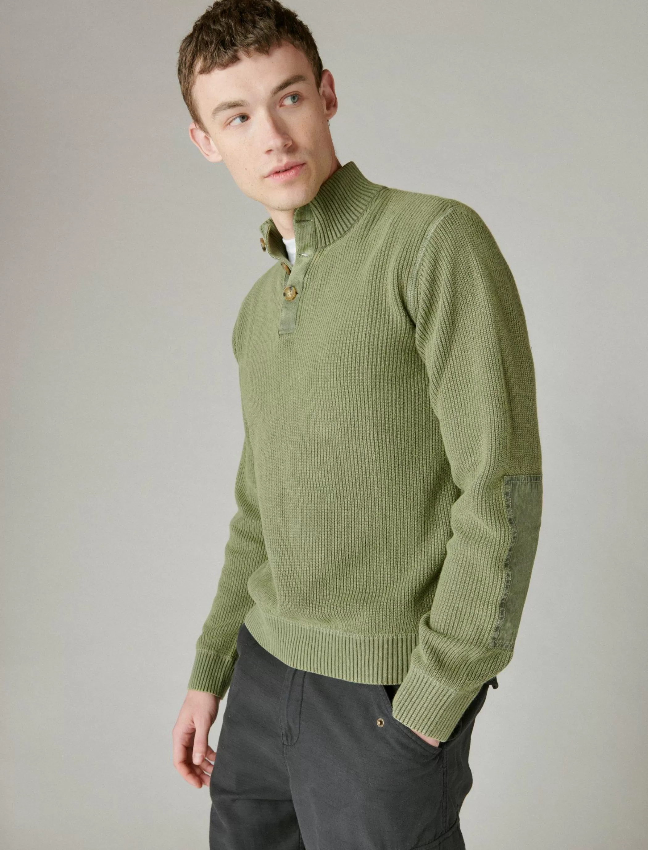 Level up your cool-weather wardrobe with this mock neck sweater. Featured in a rad acid wash effect, this long sleeve style features a buttoned collar, mixed media details at the elbows and ribbed cuffs.