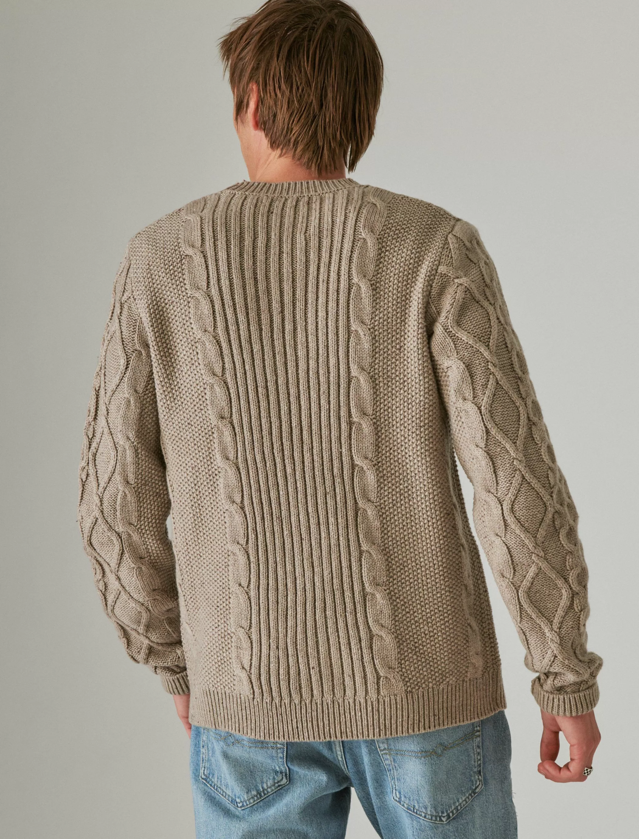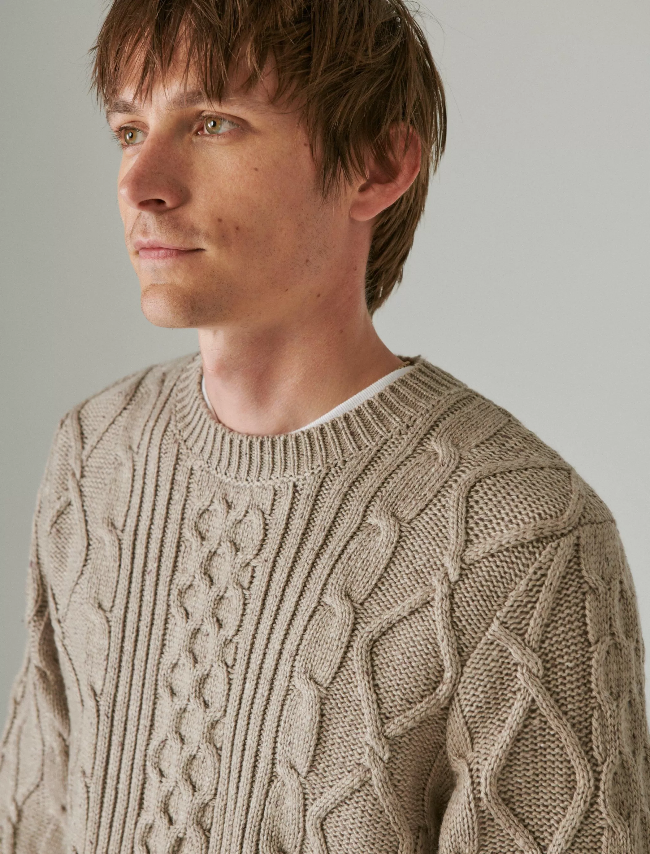 A classic for your cool-weather wardrobe, this tweed crewneck sweater has a timeless cable-knit design and ribbed details in a soft acrylic-blend fabric with a touch of wool for added warmth.