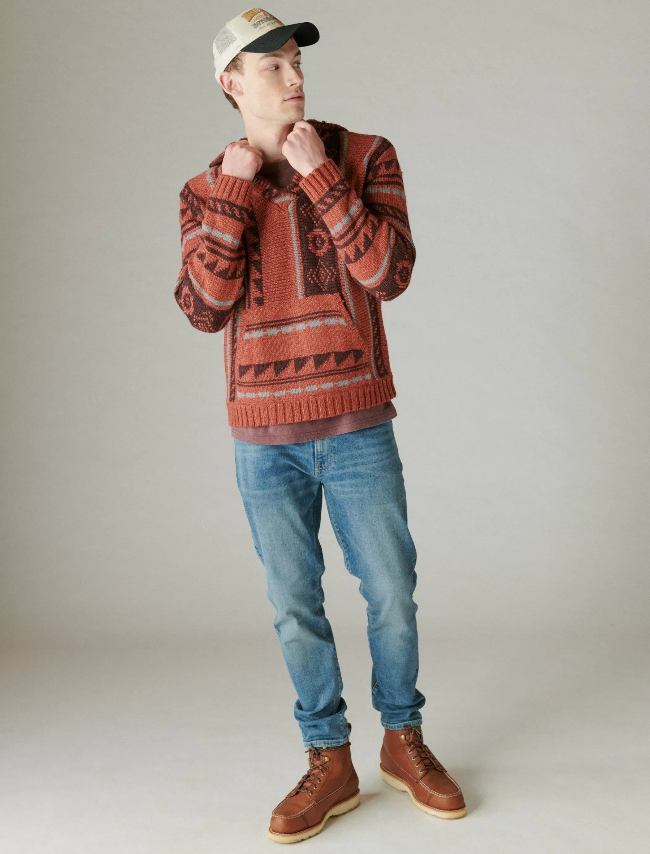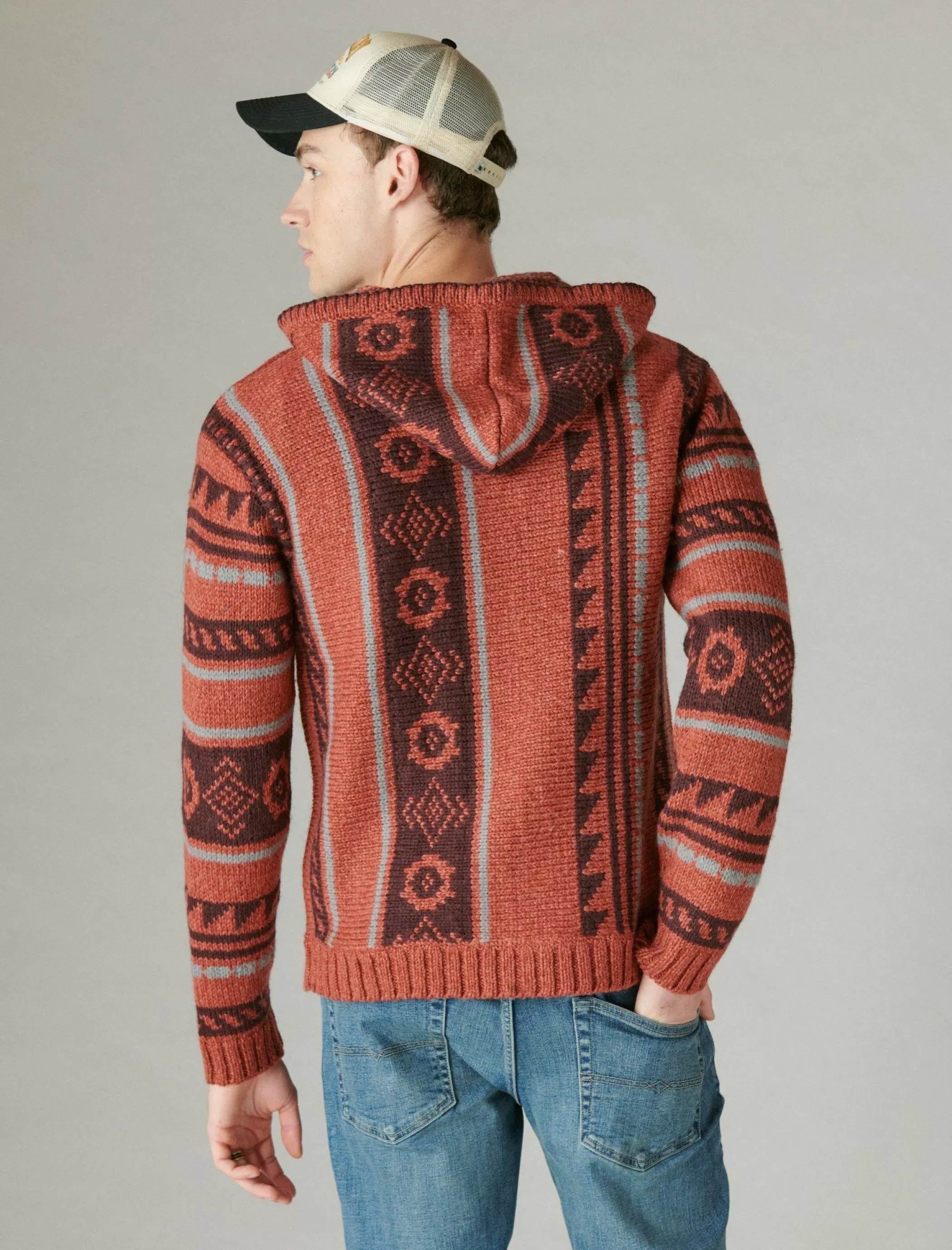 When the temps take a dip, pull on this warm baja sweater. Featuring a Southwestern-inspired print, this cozy wool-knit style has a hood, front kangaroo pocket and textured ribbed details.