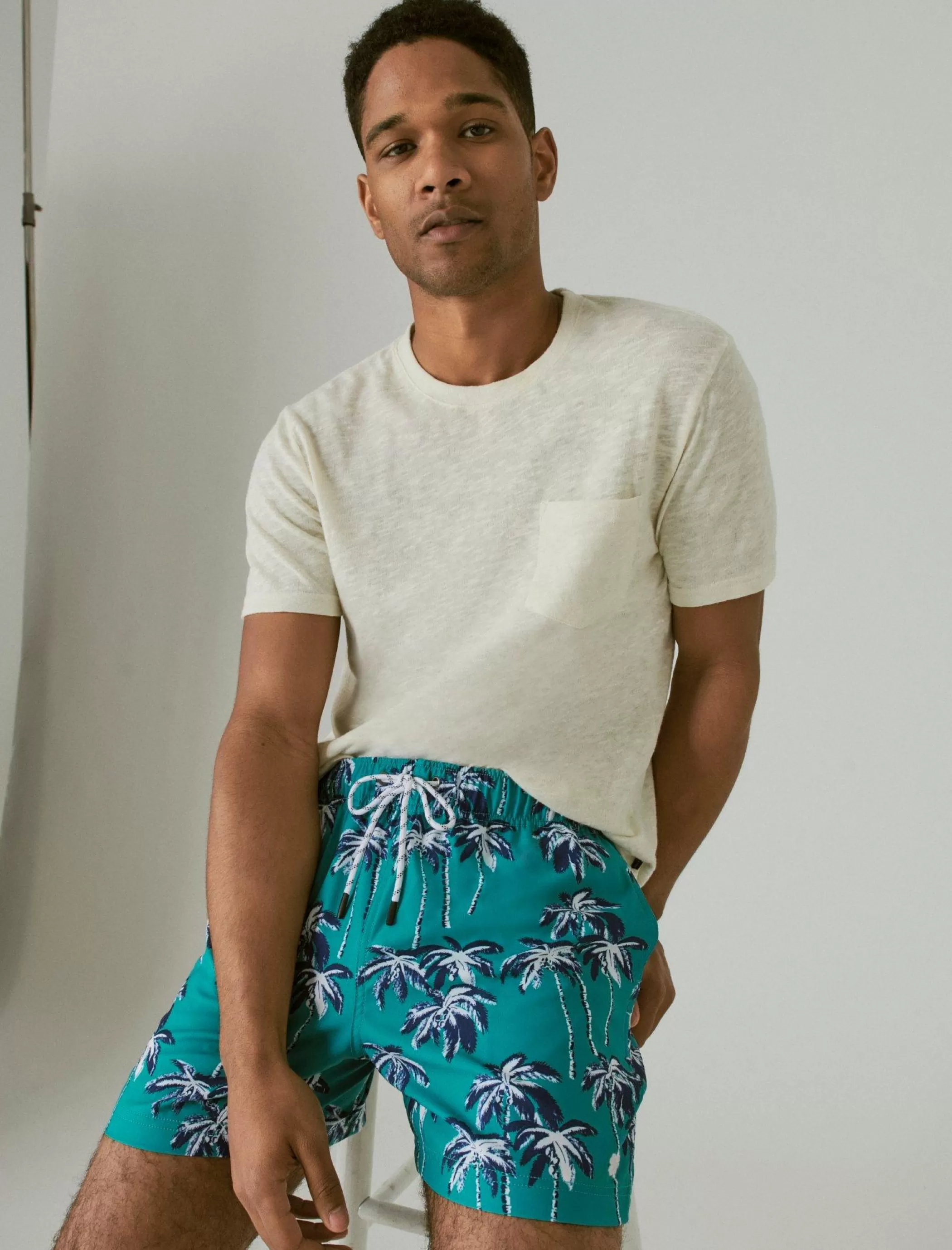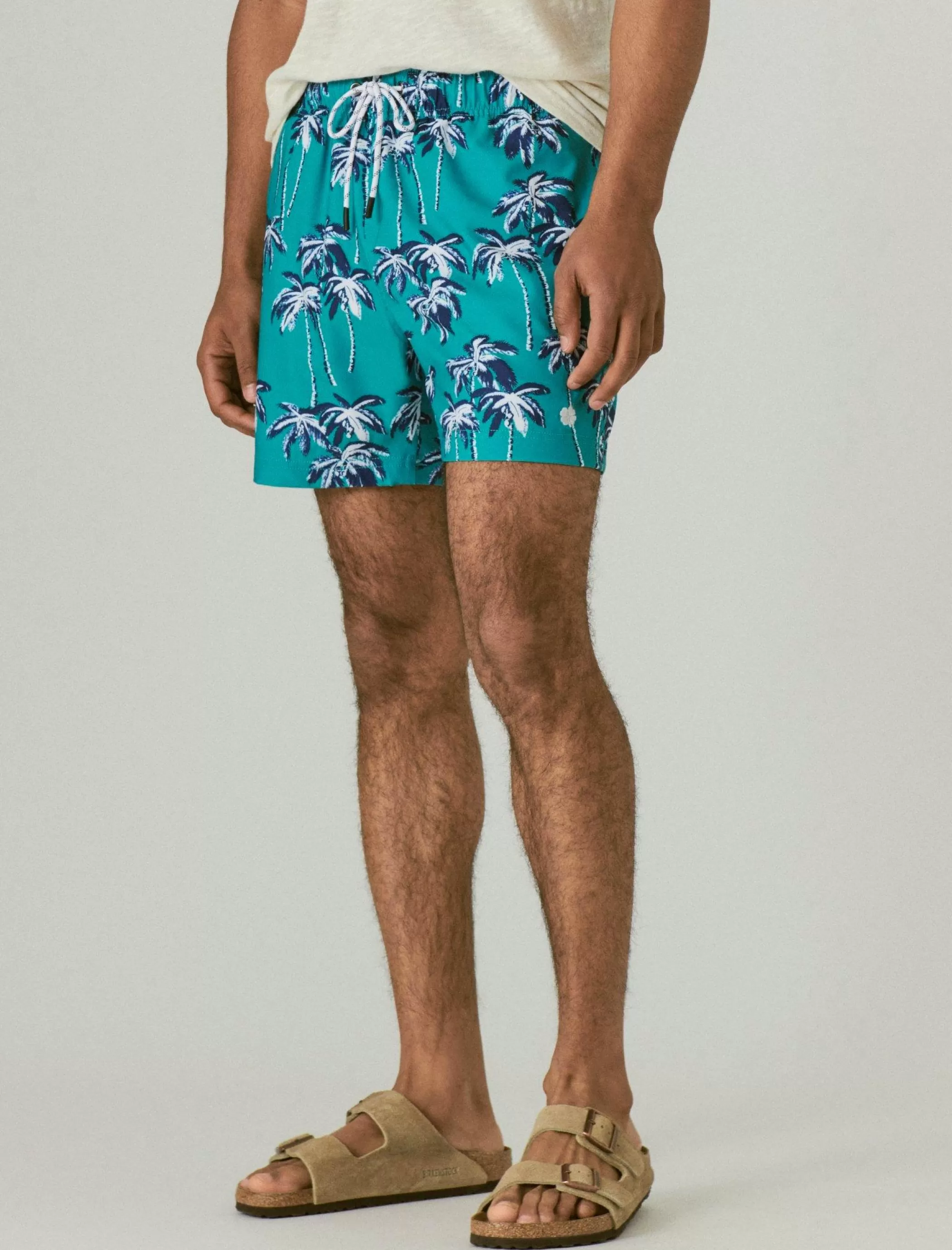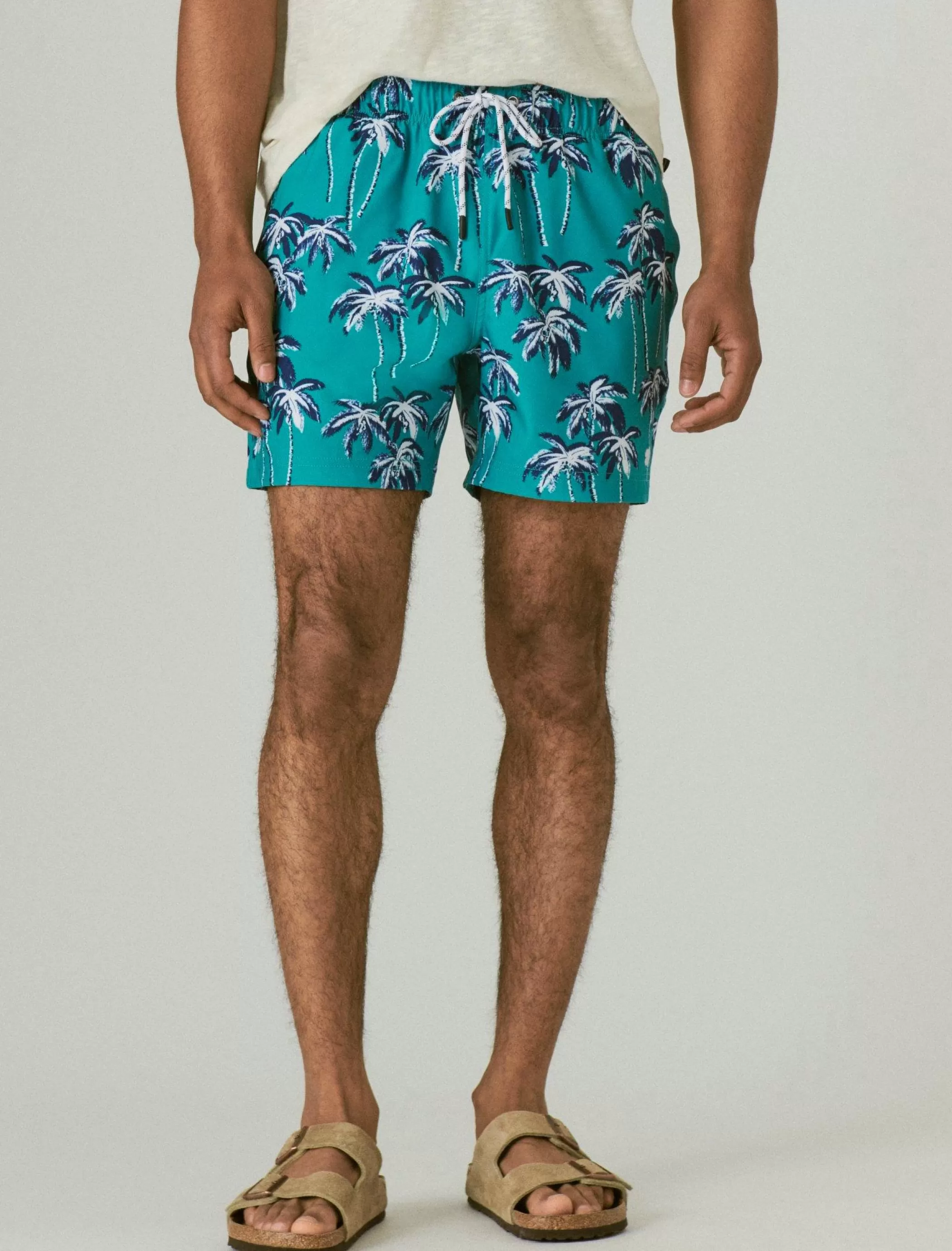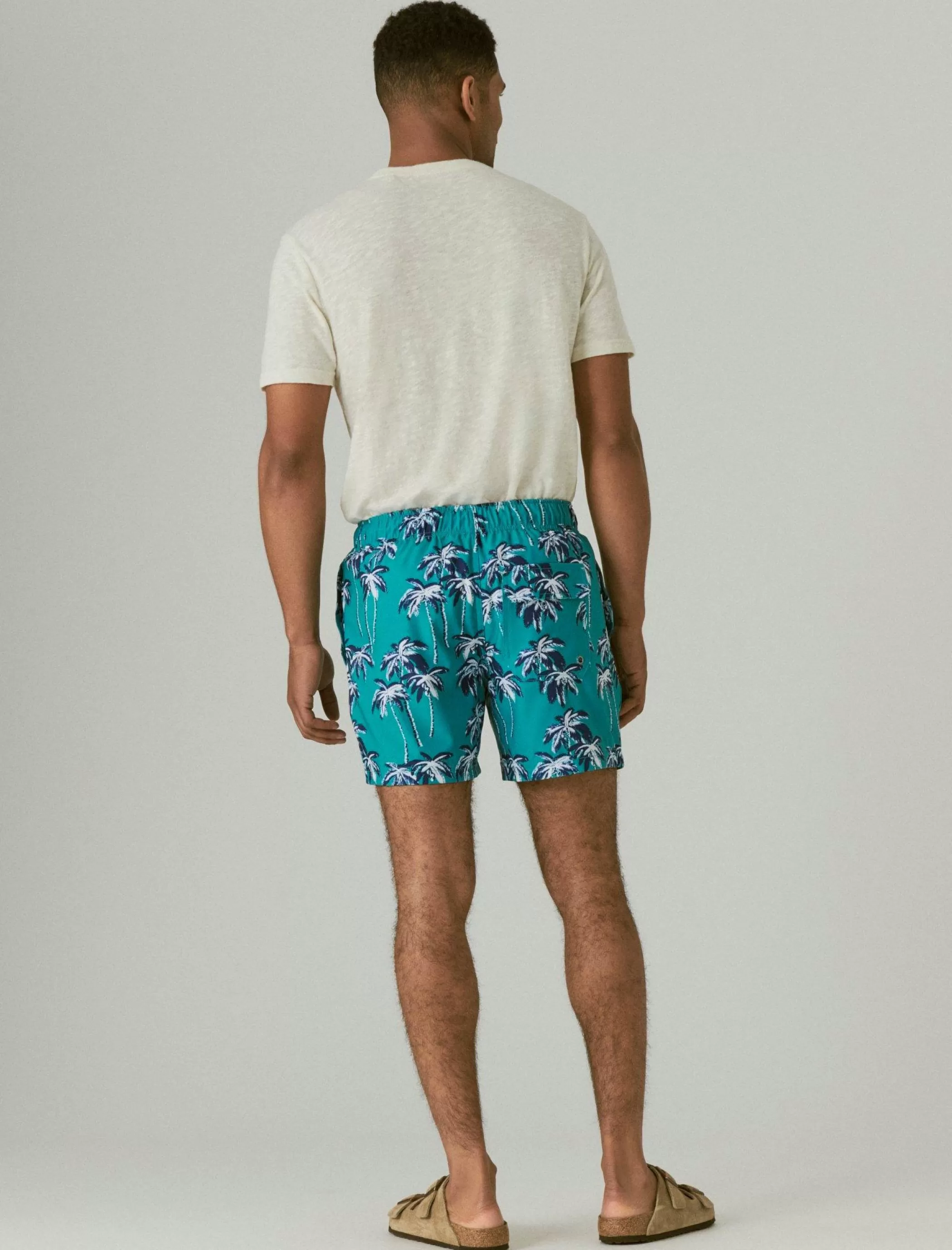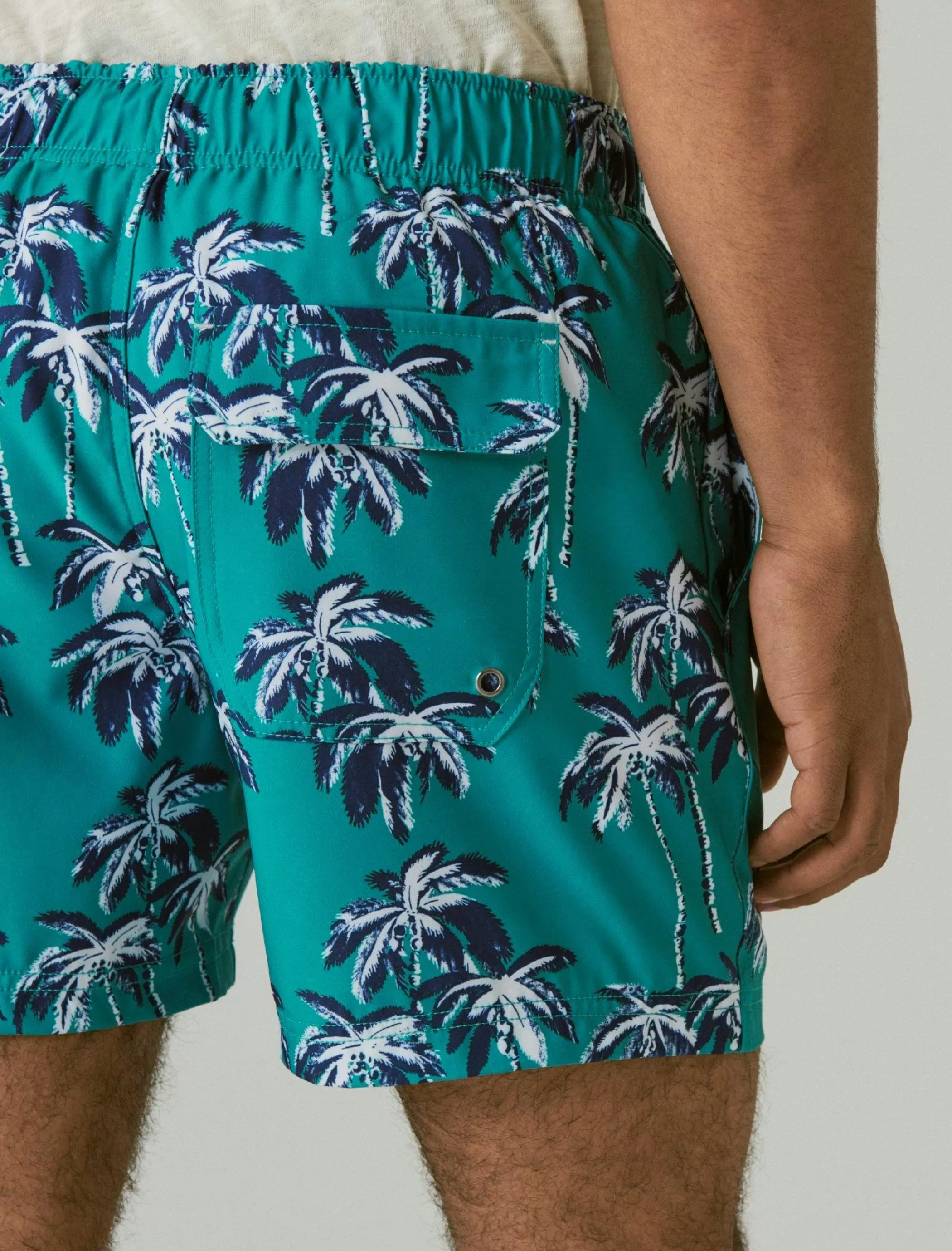 Stay comfortable in and out of the water with this above-the-knee stretch swim short, featuring a printed design, multiple pockets and an adjustable drawstring waist.