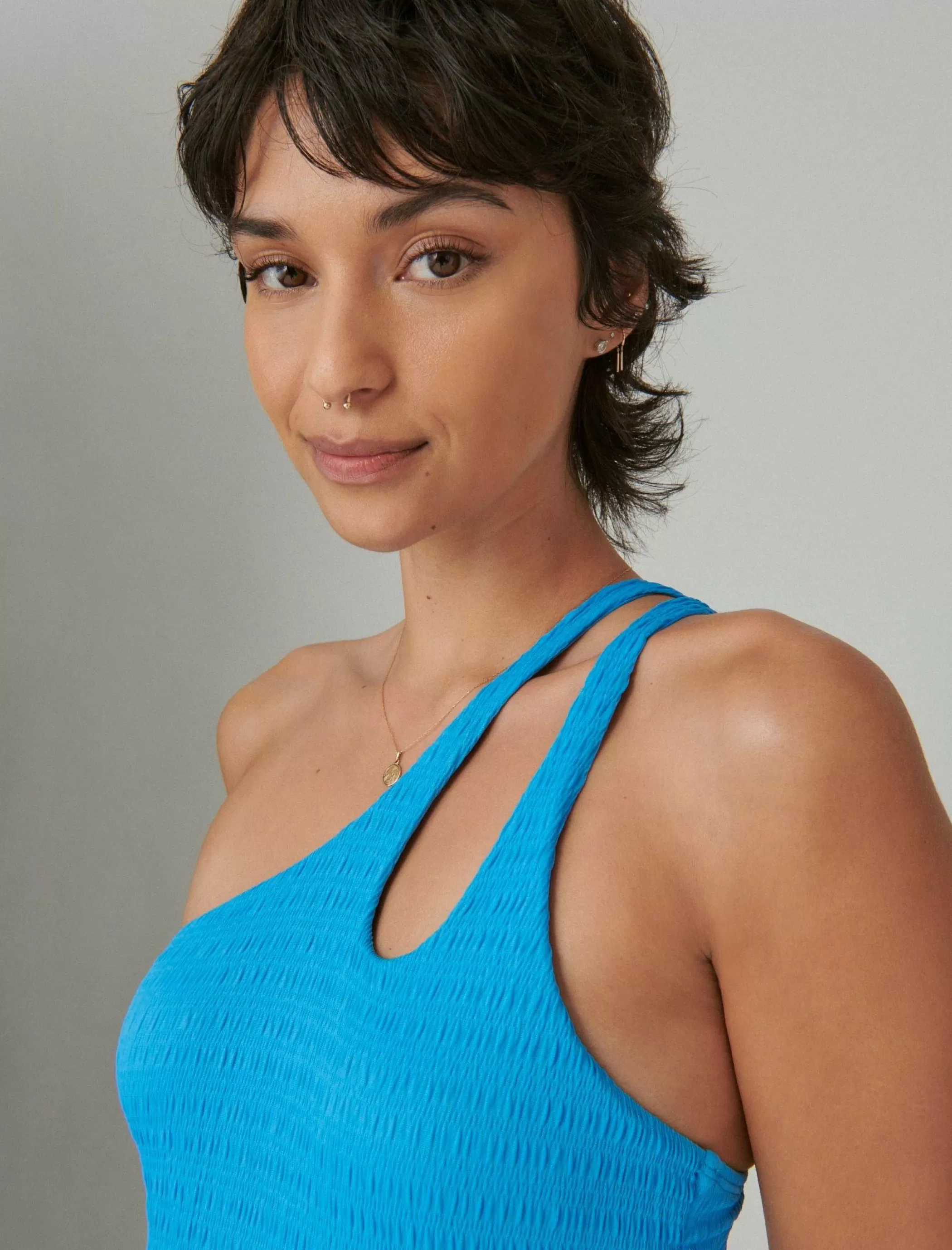 Featured in a textured seersucker fabrication, this one-piece swimsuit shows off an asymmetrical cut-out design at the single shoulder strap that adjusts to the perfect fit.