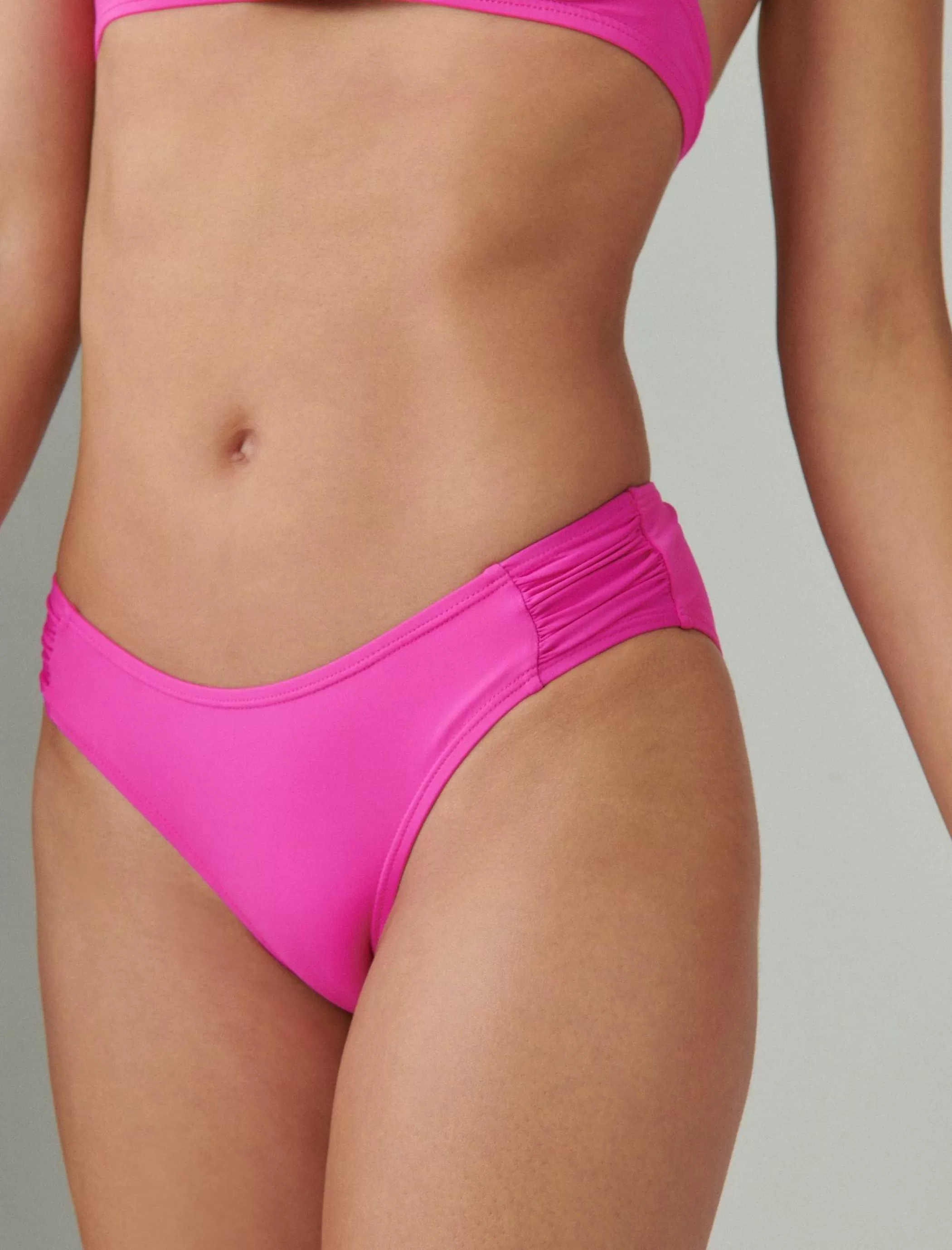 A mid-rise bikini bottom that features ruched details at the sides and moderate rear coverage.